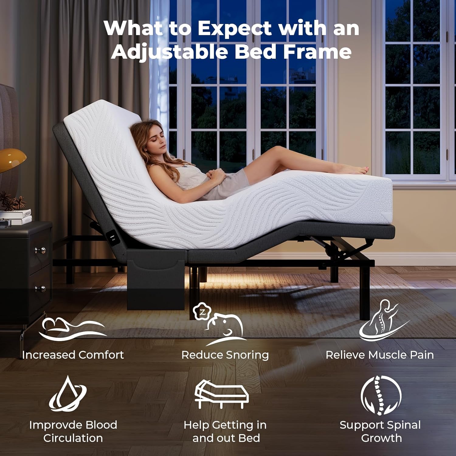 STABLE METAL FRAME CONSTRUCTION: Constructed from a thicker metal frame, the adjustable base has a stable weight capacity of up to 750 lbs far higher than the ordinary iron mesh. After 30,000 times of folding resistance test to ensure a smoother lifting and lowering of the bed frame. The surface of the bed base is covered with non-slip fabric and the mattress stopper at the end of the bed can effectively solve the mattress sliding sideways problem