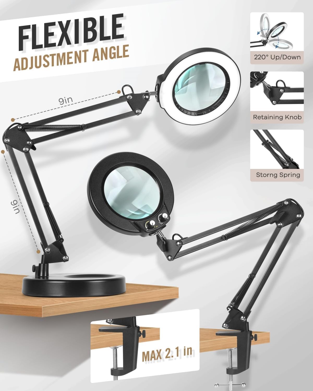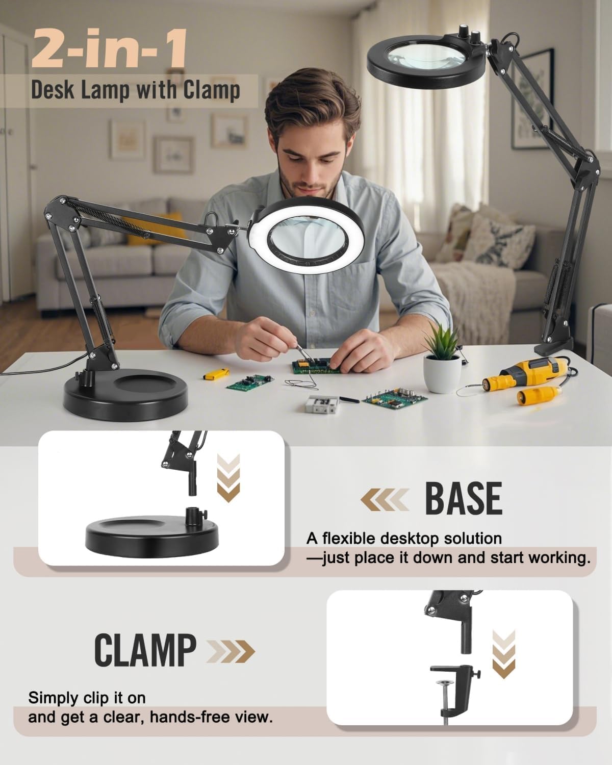 Enhance your precision with LANCOSC’s magnifying lamp, featuring a flexible swing arm design for optimal positioning and a 12X high-definition glass lens that provides superior clarity. Enjoy stepless dimming, multiple lighting modes, and a versatile 2-in-1 design for desktop or clamp use.