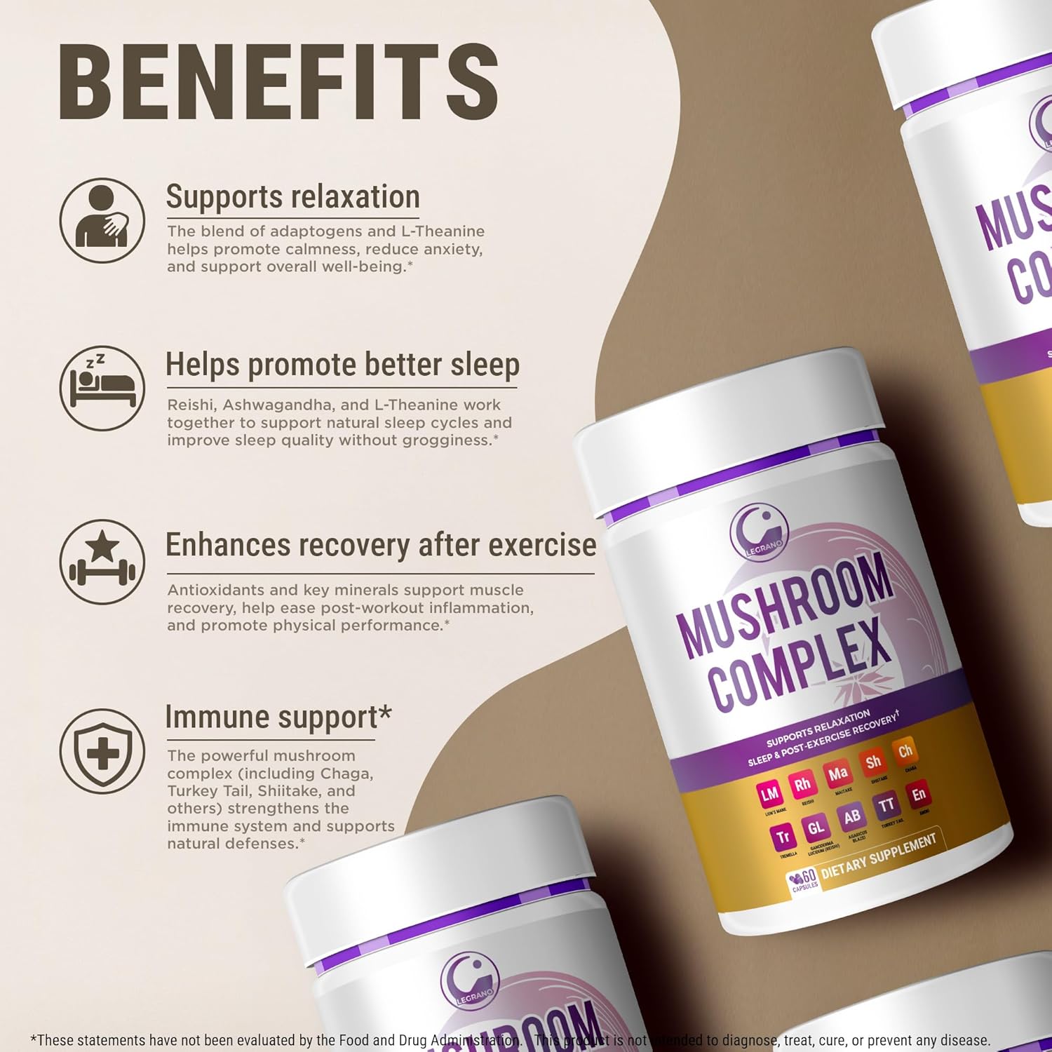 Evening Calm with Adaptogenic Mushrooms: A relaxing mushroom supplement with Lion’s Mane, reishi, and ashwagandha to help support nighttime calm without next-day grogginess.*