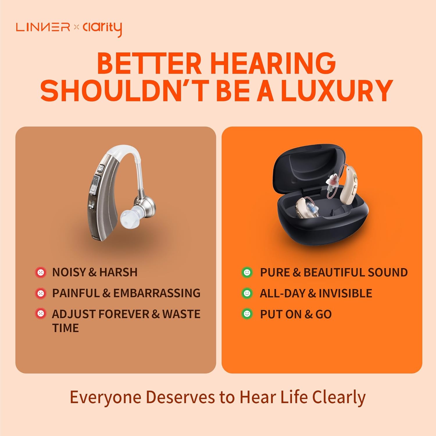 【Hearing aids for seniors – No Whistling, No Feedback】 LINNER Clarity hearing aids enhances voices while reducing background noise, helping you follow conversations with ease. Enjoy natural, comfortable hearing with zero feedback or whistling, even at higher volume levels.