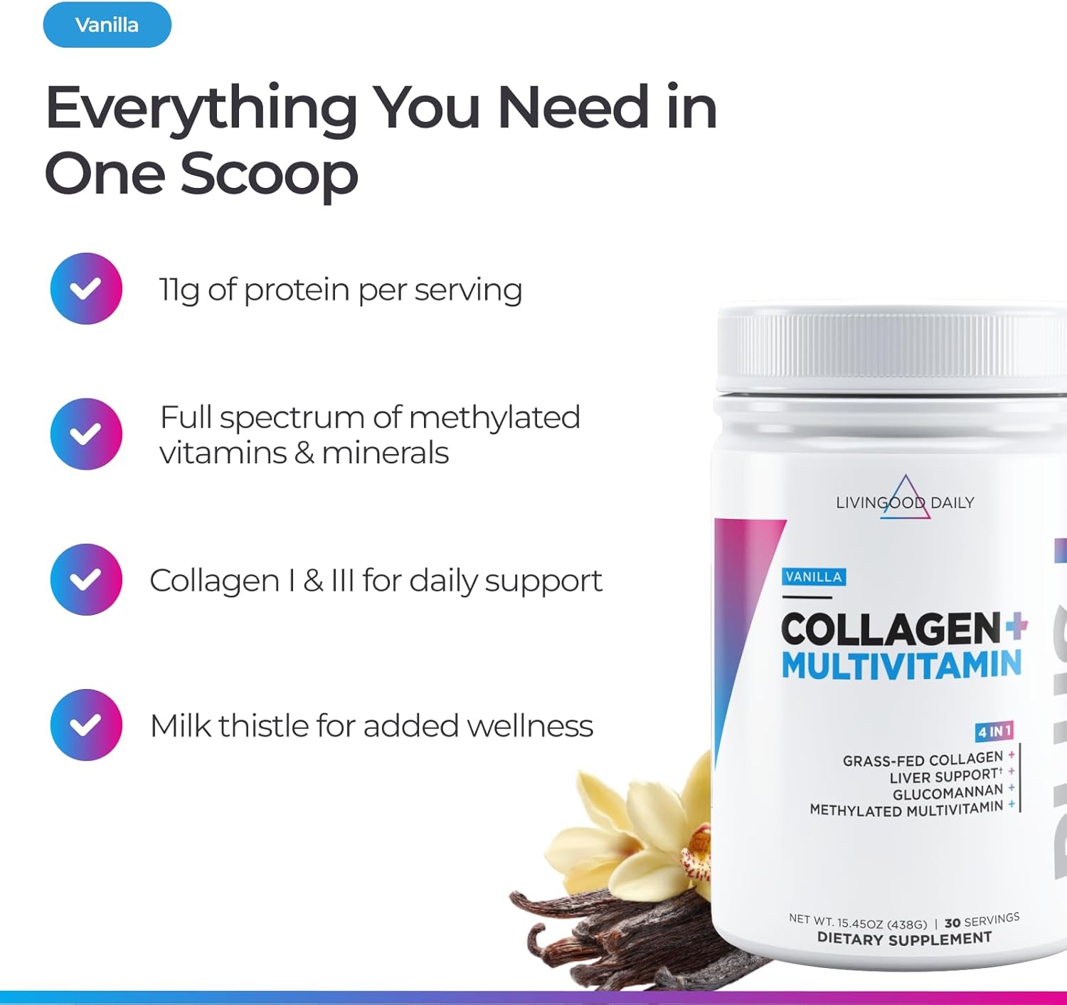 ADVANCED COLLAGEN POWDER: Livingood Daily Collagen + Multi is a synergistic blend of skin, hair, nail, and gut-friendly, grass fed collagen + vitamin C supporting absorption + a full bottle of multivitamins and minerals + added benefits of milk thistle.