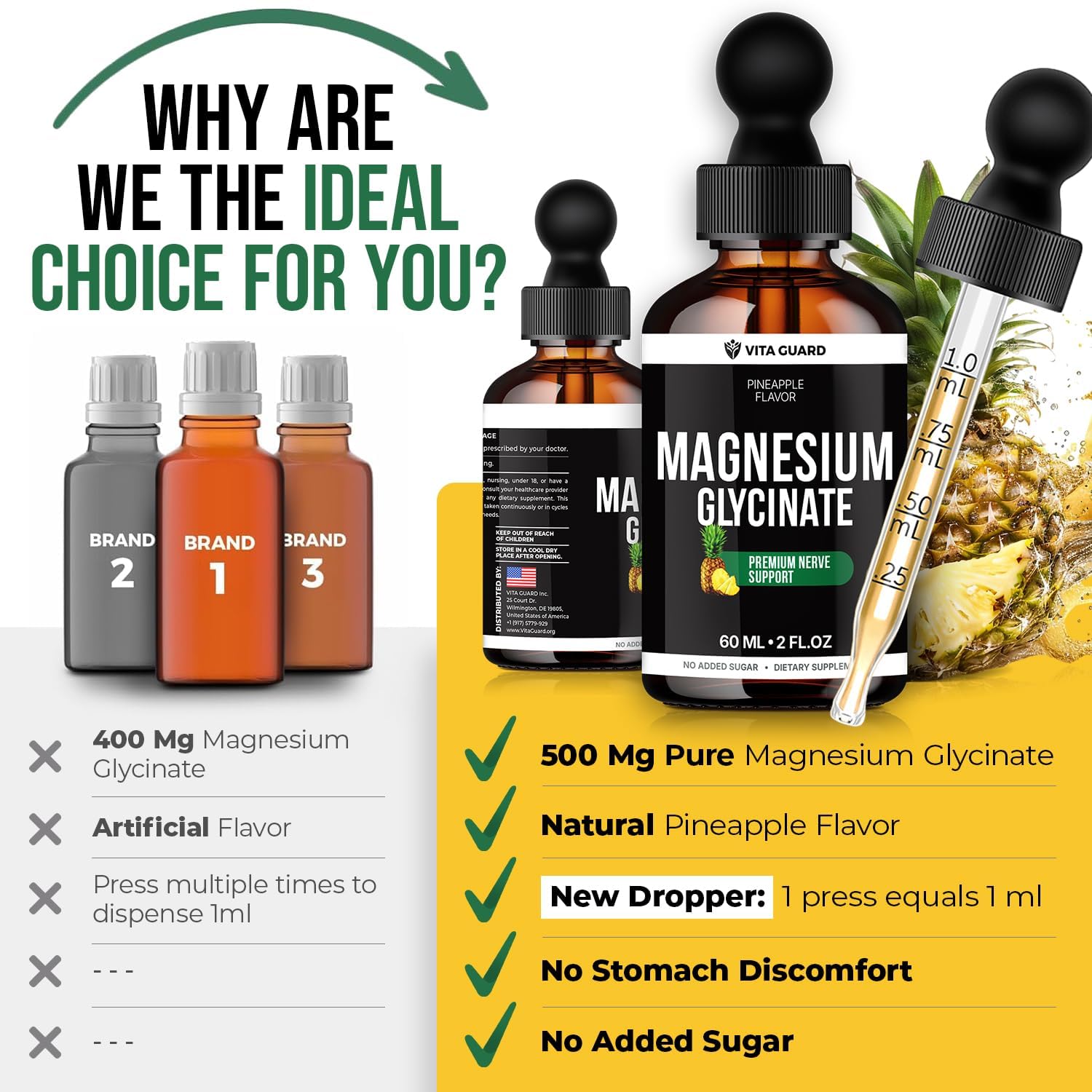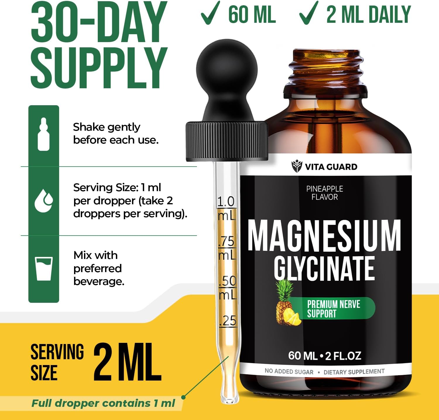 Magnesium Glycinate Liquid Formula – Provides 500 mg of magnesium glycinate per serving in a convenient liquid drop format for daily supplementation.