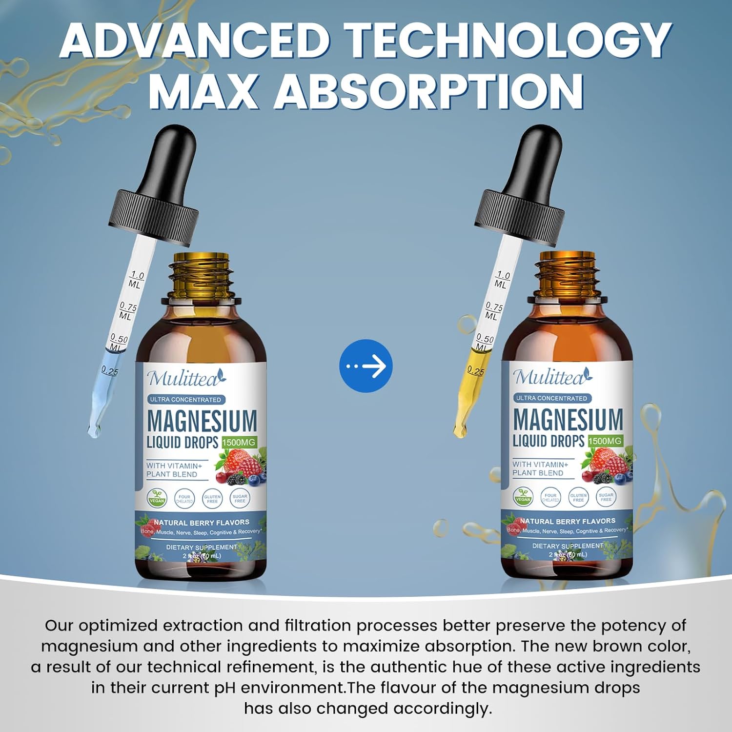 ADVANCED TECHNOLOGY FOR MAX ABSORPTION:Our optimized extraction and filtration processes better preserve the potency of magnesium and other ingredients to maximize absorption. The new brown color, a result of our technical refinement, is the authentic hue of these active ingredients in their current pH environment.The flavour of the magnesium drops has also changed accordingly.
