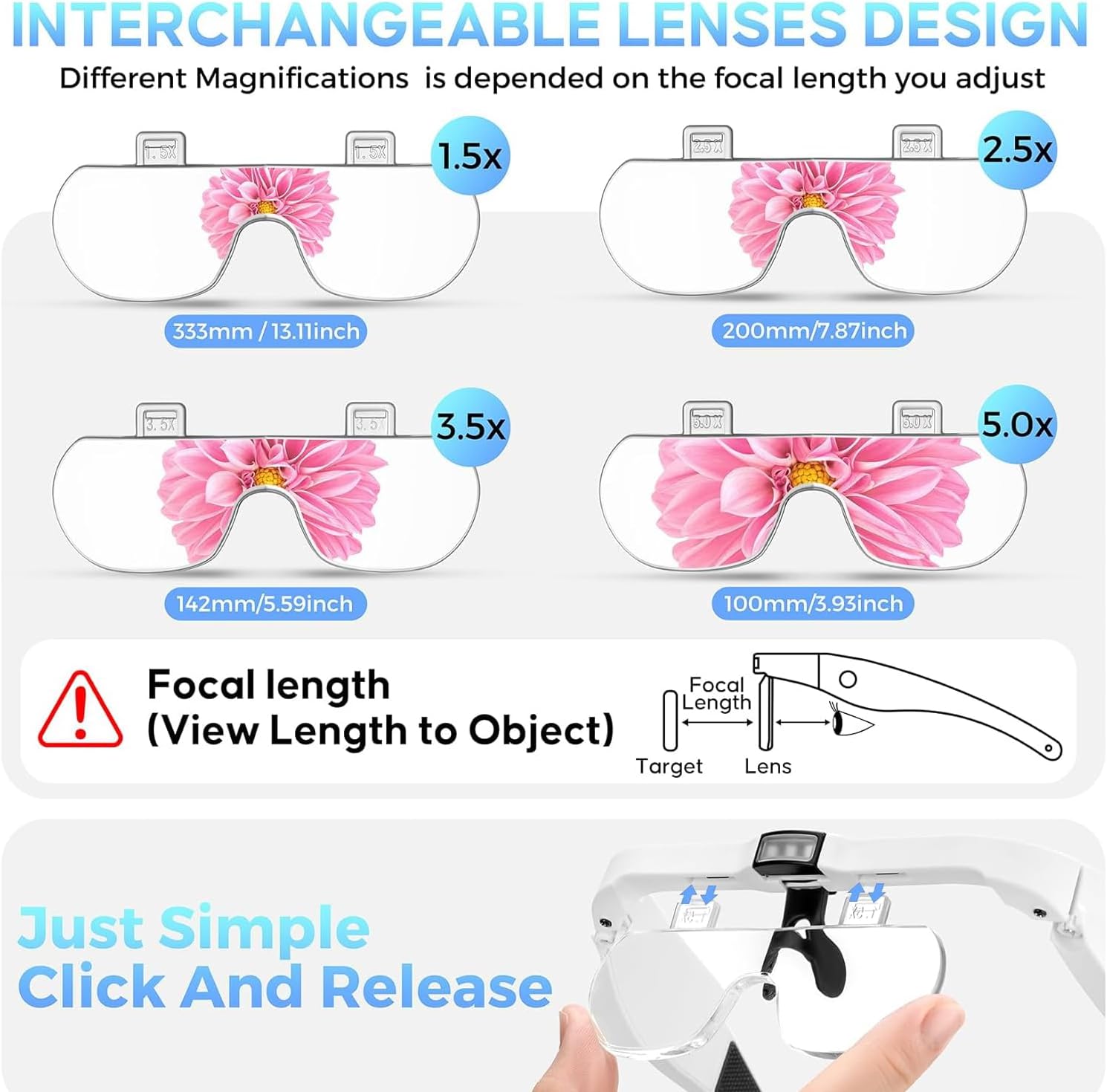 ✔Detachable & Durable&High Definition Lenses: Lighted magnifying glass is designed with detachable lenses (4 Lenses Magnifications: 1.5X, 2.5X, 3.5X, 5X), which are made of acrylic resin material, reach 5H hardness of the surface of the lens, more wear-resistant, not easy to scratch, high definition and light weight, very durable and not easy to deteriorate after long-term storage. Focal length (the lens length to the object.): 13.11inch(1.5X), 7.87inch(2.5X), 5.59inch(3.5X), 3.93inch (5X). NOTE: Every lens has a fixed focal length, please slightly adjust the distance between the lens and the object to focus and get the optimal clarity.