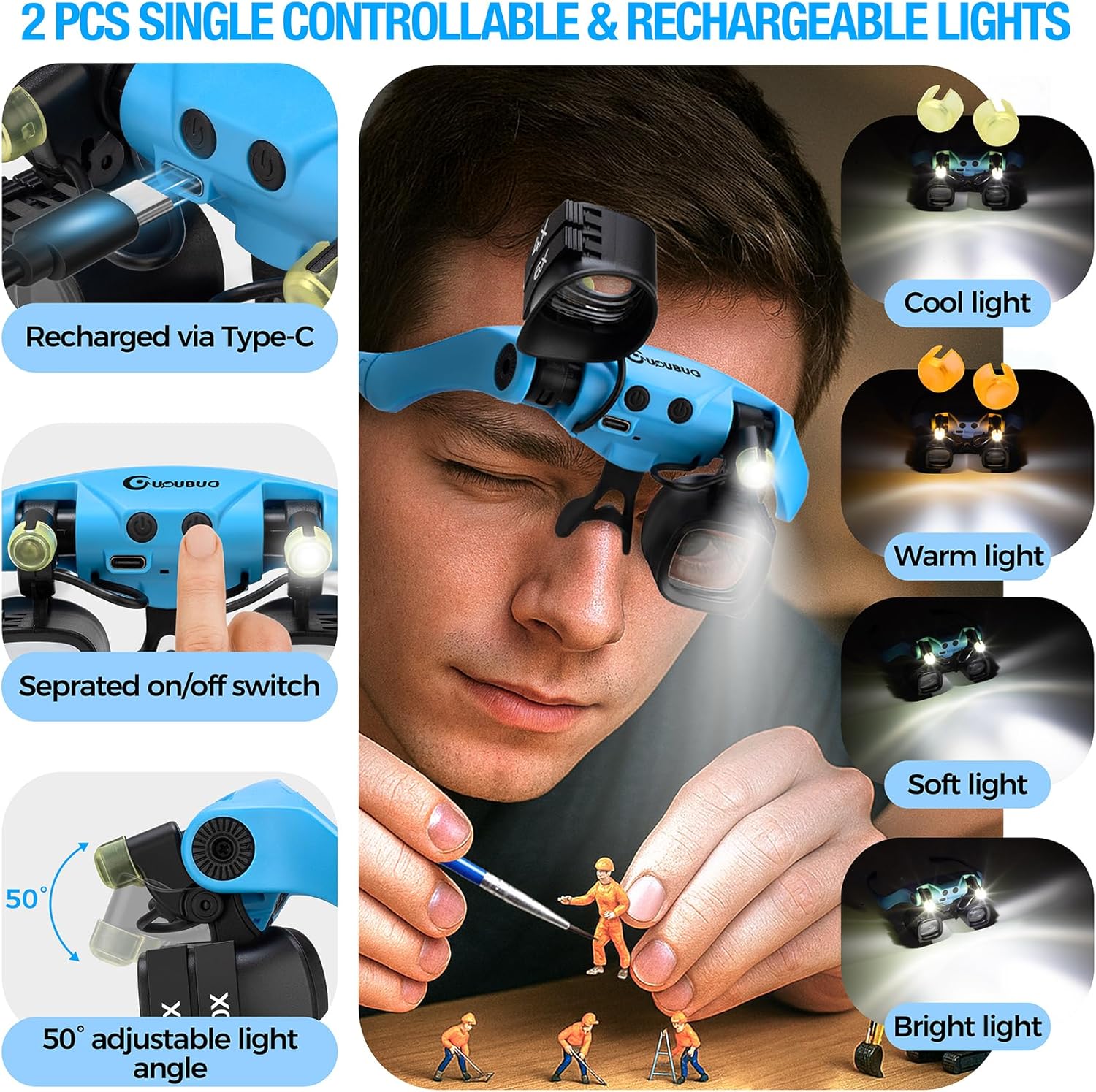 GUOUBUO Magnifying Glass with Light, 2X 4X 6X 10X 13X Magnifying Glasses Lens, Switchable Binoculus Loupe w/Storage Case, Rechargeable Head Mount Magnifier for Close Work Watch Repair Crafts Jewelry