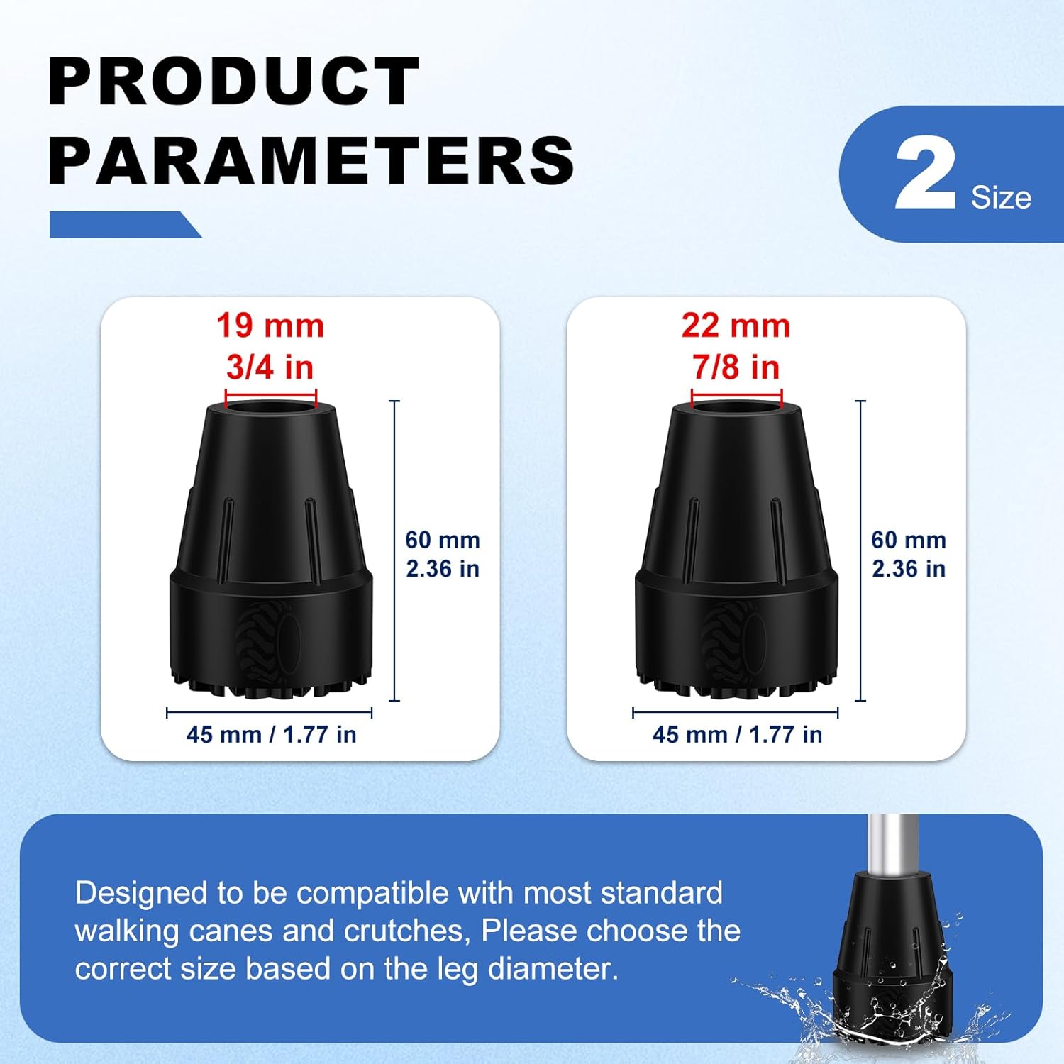 These universal cane tips are designed for 3/4 inch (19 mm) or 7/8 inch (22 mm) cane shafts and fit most canes, walking sticks, and crutches securely. Please measure the diameter of your cane shaft carefully before purchasing to ensure a proper fit.