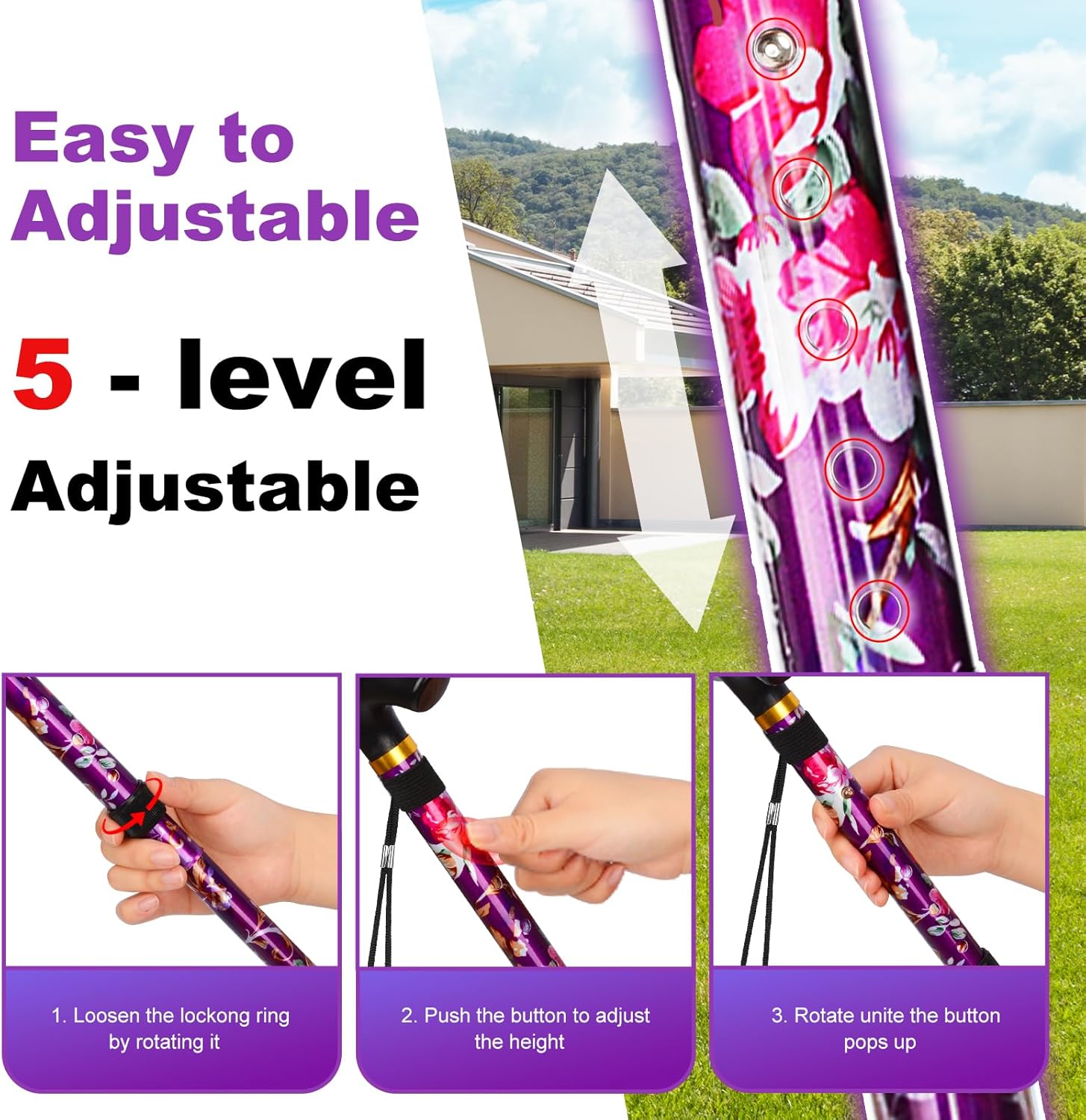 Our Folding Cane can be easily folded into 4 sections with a length of 10 inches for convenient storage and travel. It can be securely flipped back out for safe use, making it perfect for men, women, elderly, disabled individuals, and for use both indoors and outdoors