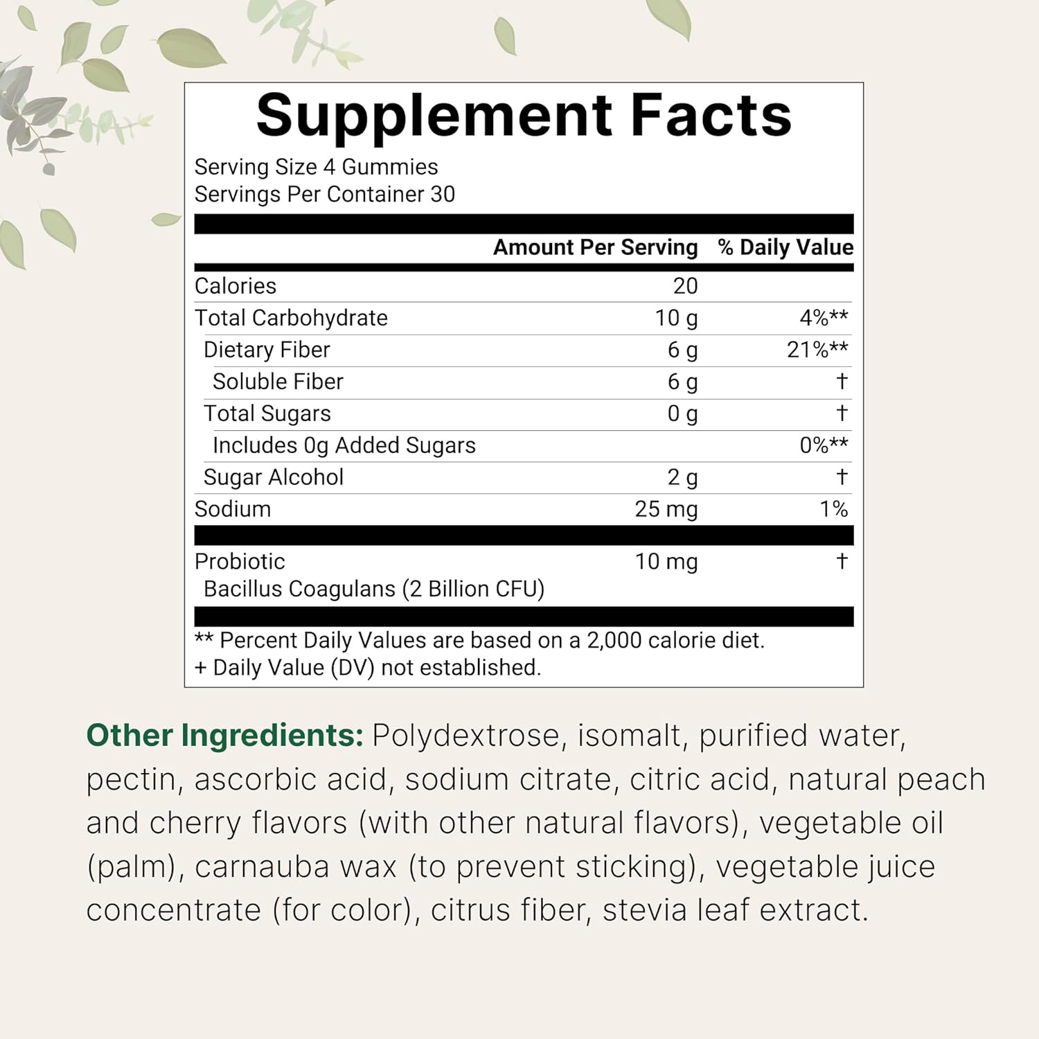 Each bottle contains 120 naturally flavored gummies that provide 6g of fiber and 2 billion CFU probiotics from Bacillus Coagulans for a well-rounded fiber gummy formula.