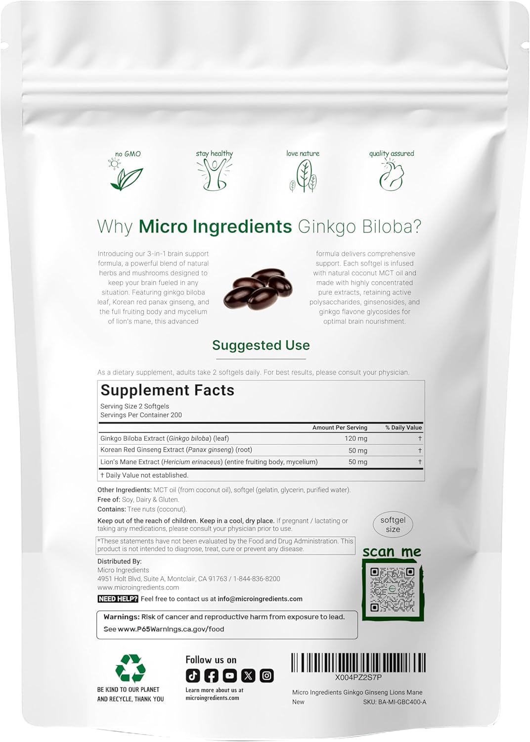 Micro Ingredients offers a highly concentrated 3-in-1 softgel formula featuring ginkgo biloba, Korean red panax ginseng, and full-spectrum lion’s mane mushroom fruiting body and mycelium extracts.