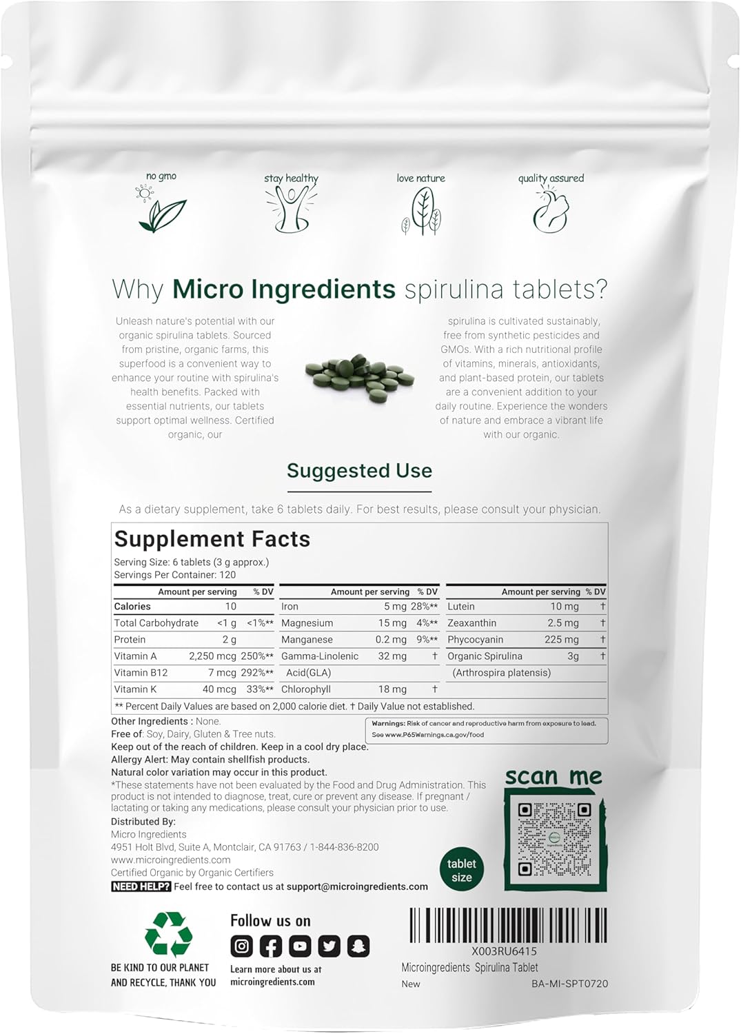 USDA Organic Spirulina Tablet from Spirulina Powder Organic (Arthrospira Platensis), 3000mg Per Serving, 720 Counts (4 Months Supply), Green Algae Super Food, Vegan Friendly, Filler Free, Irradiation Free, Easy to Swallow.