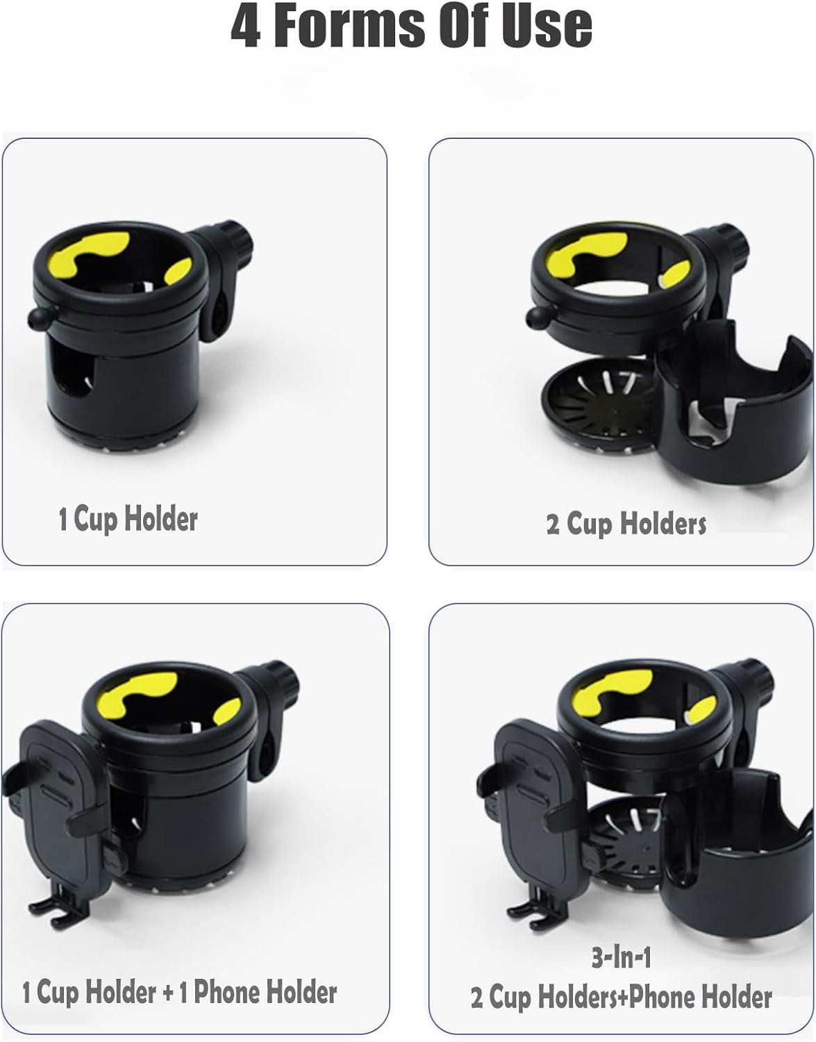 🍺👩🦼2 in 1 Drink holder/cup holder: The walker cup holder can be split into two, allowing you to use one or two cup holders.Our cup holders for walkers can fit short cups and tall bottles With an adjustable and secure grip, this walker phone holder can fit your phone no matter the size.The cup holder has a diameter of 3.4 inches and a height of 4.5 inches, providing ample space for your drinks.