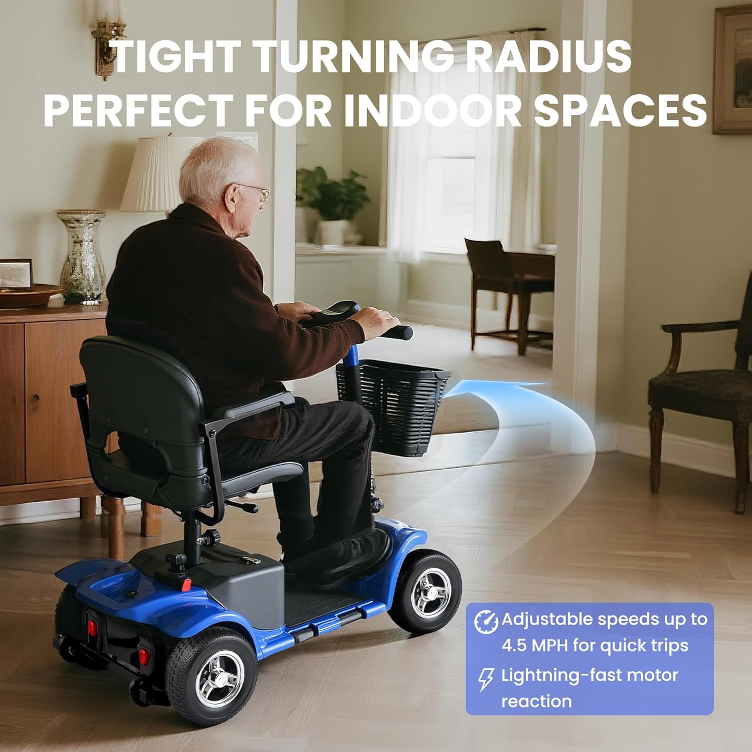 1. The mobility scooter has a compact and convenient design and can support up to 300lbs.With 24-volt 12AH battery charges on or off the scooter. With all-terrain thick tires, and dual rear shock absorbers,this all-terrain mobility scooter minimizes bumps on rugged roads and ensures it stays upright.