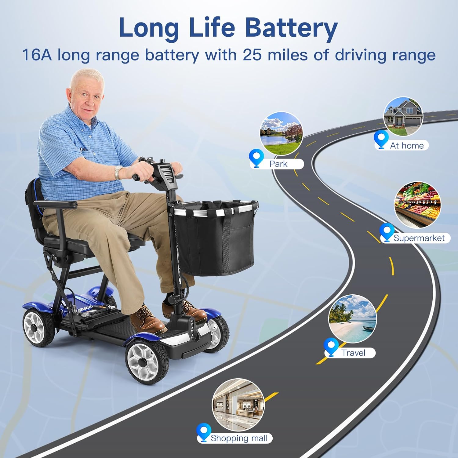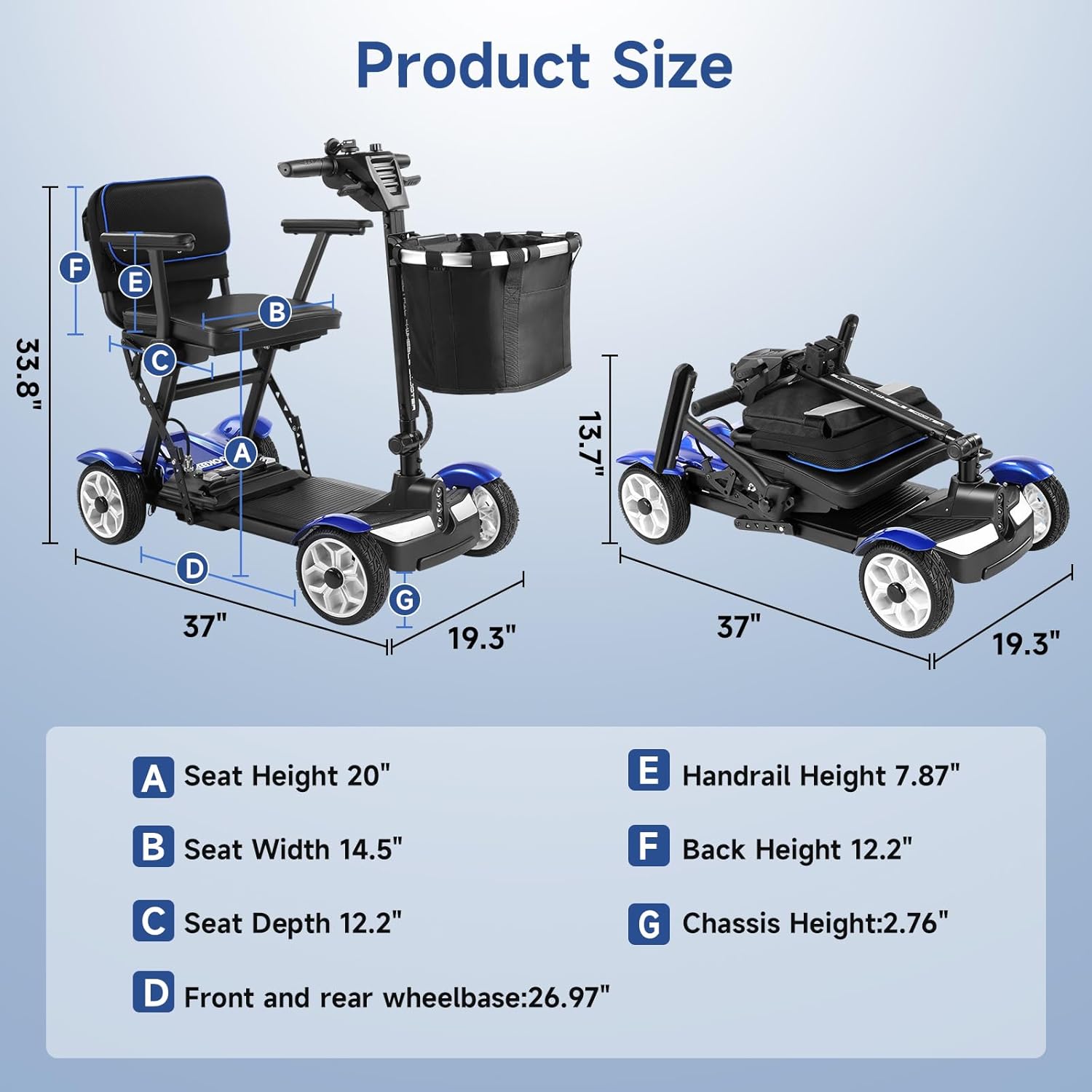 Foldable Design:The senior mobility scooter folds in 3 steps without disassembly.the durable high carbon steel support frame is stronger and safer, and the folded dimensions of 37×19.3×13.7 inches can easily fit in the trunk of your car or anywhere in your home.