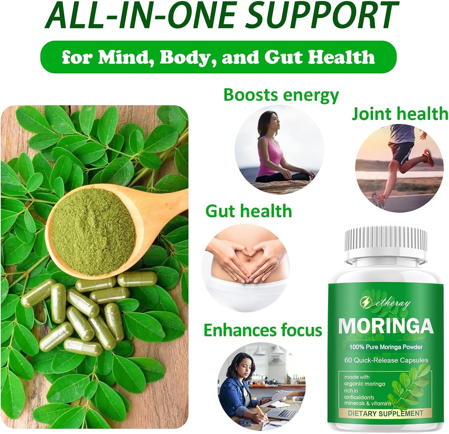 [Rich in Nutrients]: Moringa contains more nutrients than any other plant, including 27 vitamins (such as A, B, C), 9 essential amino acids, antioxidants, minerals, and other nutrients, supporting the body’s natural defense functions