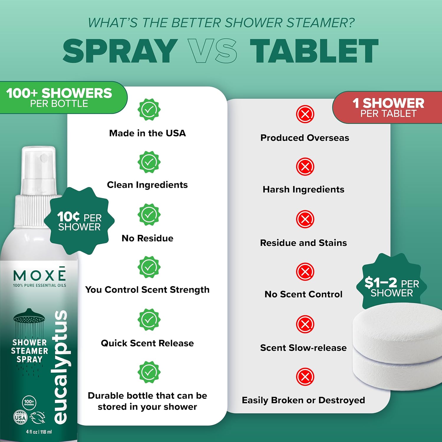Each bottle of our eucalyptus aromatherapy shower spray is made in the USA and contains enough spray for up to 100 showers, making it an excellent value for money when compared to shower bombs, bath bombs or shower steamers. You can enjoy the benefits of aromatherapy for weeks to come, without the need to constantly repurchase, turning every day into a spa day.
