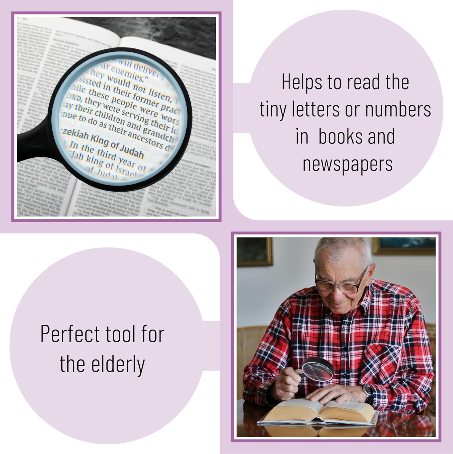 The handle with ergonomic rubber is soft and comfortable, and the non-slip rubber coating helps you grip it easily. Our magnifier glass lens’s thick and sturdy rubber frame ensures it stays perfect.