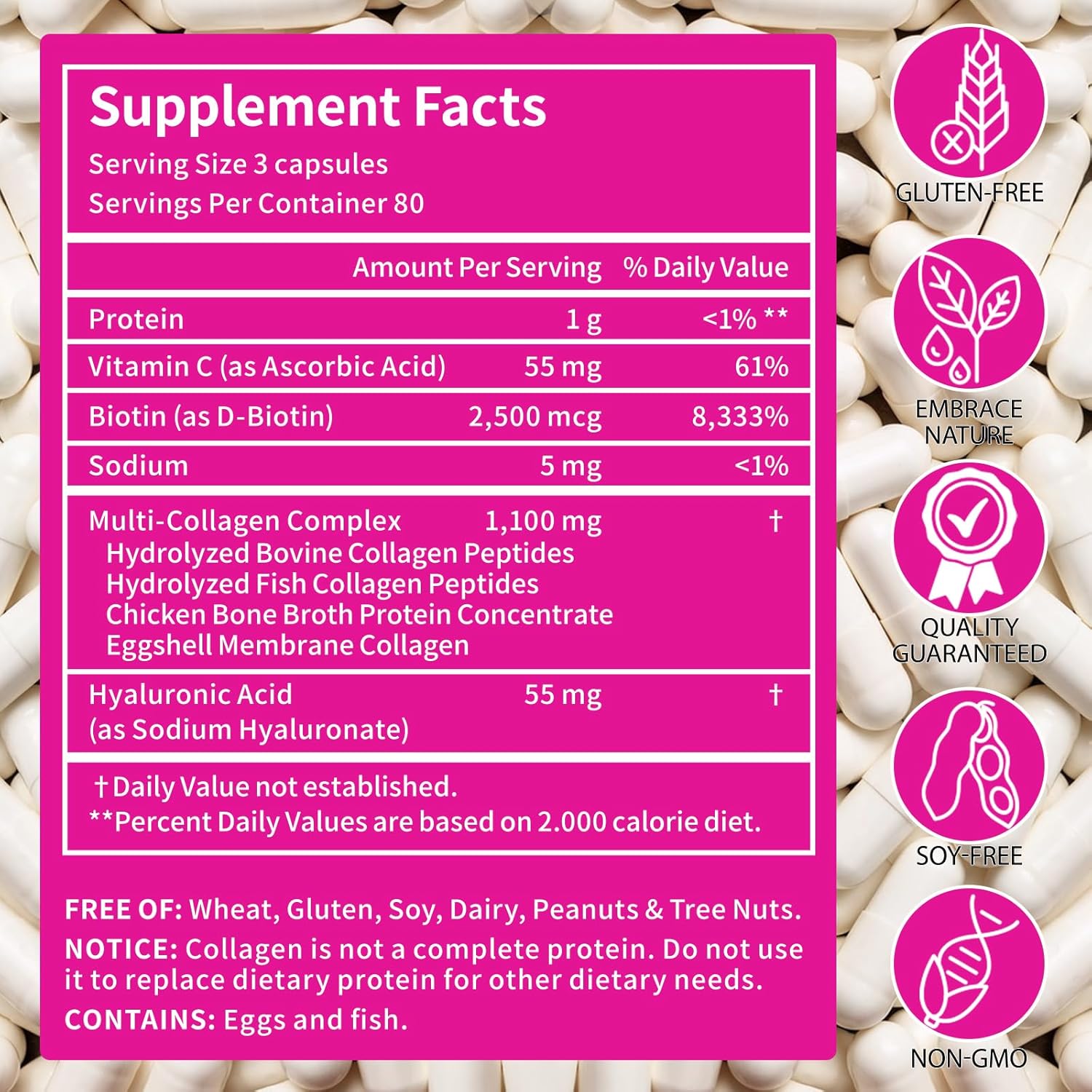 2. 1,100 mg Hydrolyzed Multi-Source Peptides for Better Absorption | Made with hydrolyzed collagen peptides from fish, chicken bone broth, eggshell membrane, and bovine sources. The small molecular structure makes it easy for the body to absorb and utilize efficiently.