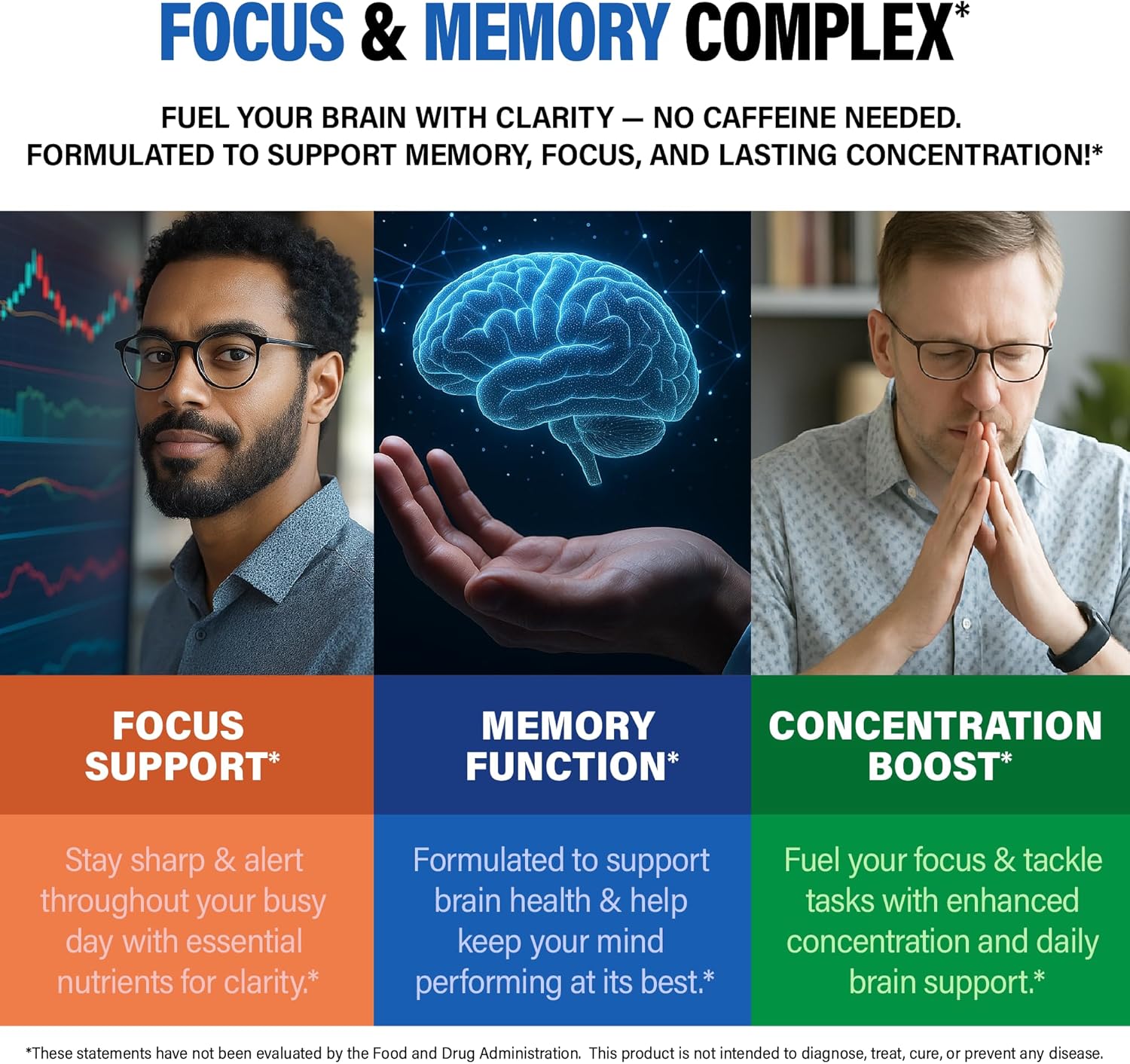 Focus & Memory Complex — stay sharp & focused naturally. Our focus & memory complex of multivitamin for men is crafted to support clarity, memory, and concentration without caffeine. Designed to keep your mind alert and performing at its best, this blend pairs perfectly with your lifestyle, helping you tackle your day with confidence & lasting focus.