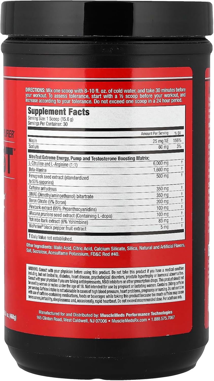 Nitrotest is an extreme androgenic pre-workout Amplifier specially formulated for advanced male athletes looking to push their bodies to their maximum potential, nitrotest contains potent efficacious doses of powerful ingredients designed to optimize testosterone, nitric oxide, energy and euphoria for the ultimate workout. 500 mg Fenugreek, 200 mg Boron citrate – Clinically Tested ingredients shown to boost testosterone and free testosterone in just one week after use. 3 g Citrulline combined with 3g Arginine plus 100mg pinebark extract – Citrulline is among the most effective booster of nitric oxide for extreme muscle pumps. However, research shows that when combined with Arginine in a 1: 1 ratio it increases plasma L-Arginine levels even more effectively. It also contains pinebark, a natural anti-oxidant shown to activate nitric oxide synthesis to increase nitric oxide, blood flow and workout performance. 350 mg caffeine, 350 mg DMAE Bitartrate, 100mg Mucuna pruriens and 80mg Yohimbe Bark Extract – These potent stimulants work through multiple neural pathways by amplifying the production norepinephrine, dopamine, serotonin and acetylcholine. This combination provides extreme energy and a mood enhancing euphoric effect that will get you laser focused and blasting through your workouts. 1.6 beta alanine-this amino acid has been shown to increase Carnosine levels, buffer exercise-induced acidosis and increase muscle endurance. Caution: nitrotest is extremely potent and should be used by men over the age of 18 ONLY.