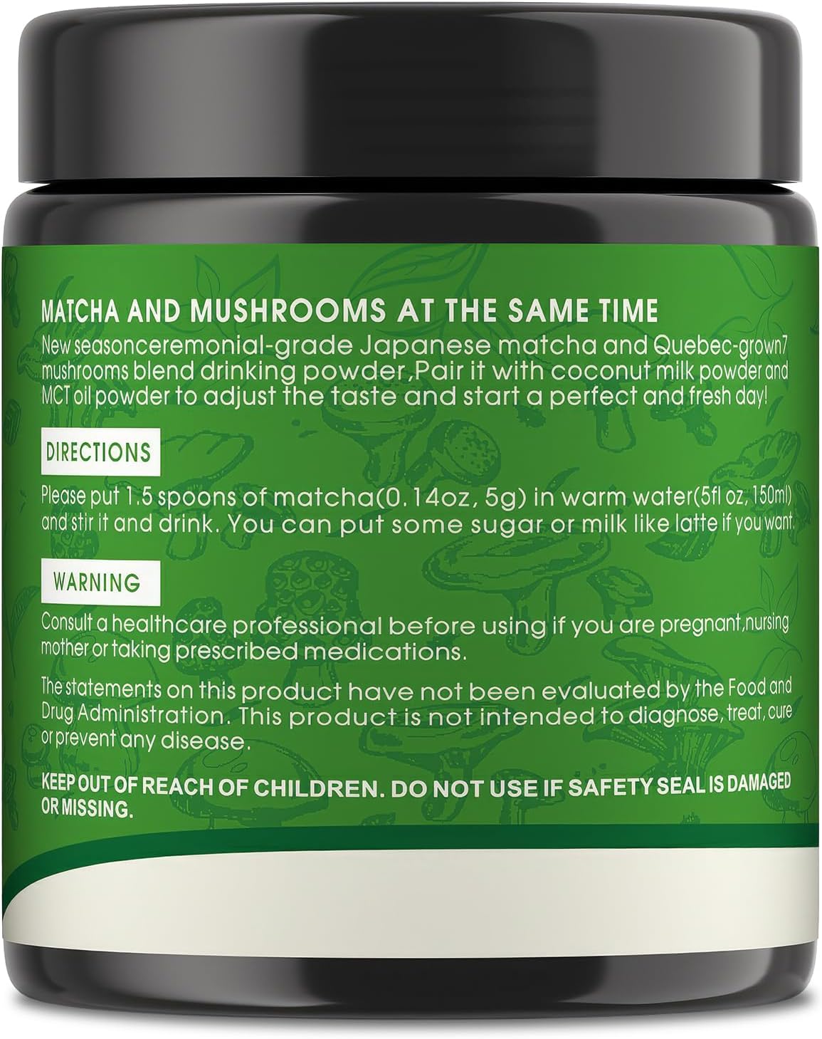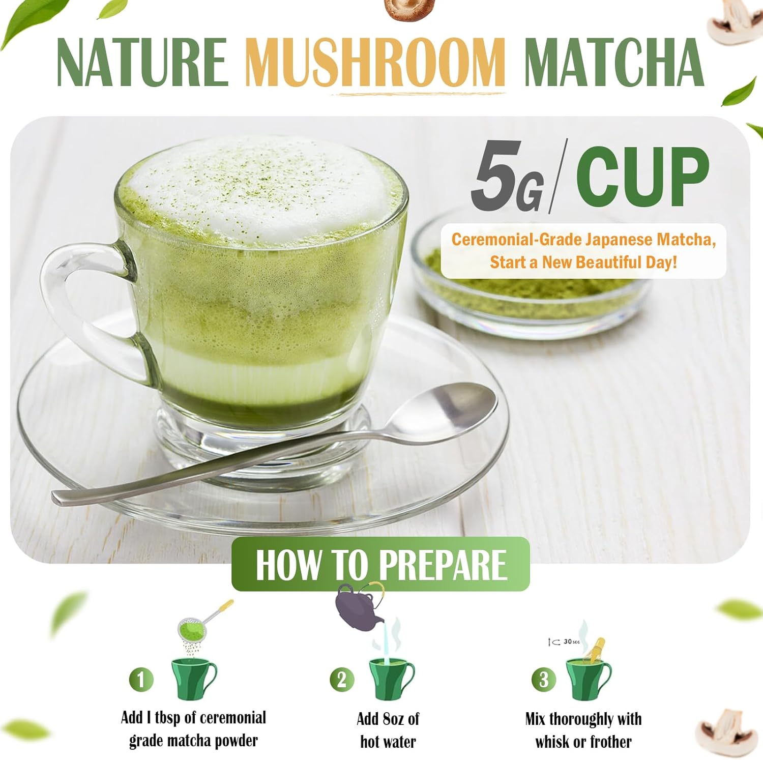 From Nature: Using ceremonial-grade Japanese matcha, which has a premium taste, along with 7 types of mushrooms blended with matcha powder, ground to perfection for a smooth taste and rich in antioxidants.