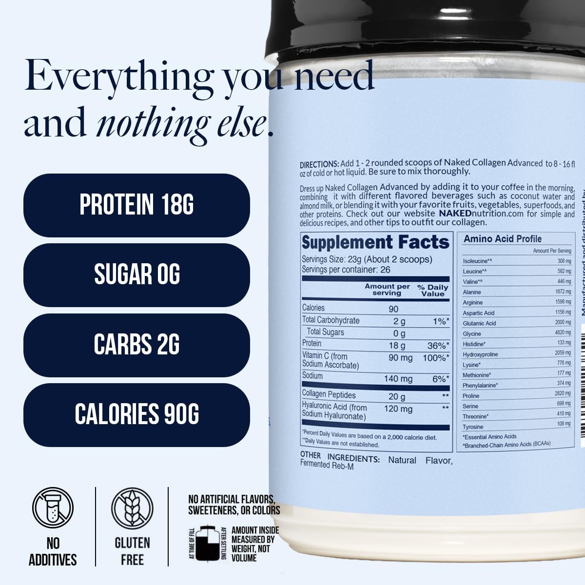 WHY NAKED COLLAGEN ADVANCED? Our pure collagen peptides powder benefits your overall health, appearance and workout recovery. Now combined with Hyaluronic Acid and Vitamin C to help the body absorb and use the collagen effectively. Our collagen is the ultimate glow from within supplement to have your best skin. Our bovine collagen powder is sourced from pasture raised European cows that eat a natural grass diet. Bigger collagen protein brands you may see on Amazon or in Whole Foods use a cheaper source from South America and do not mix as well.