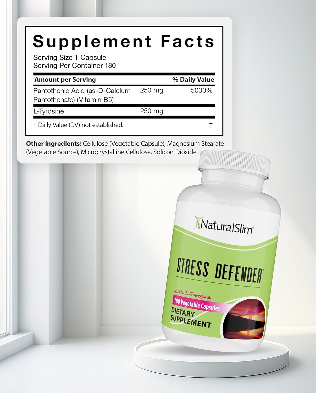 Defend Against Daily Stress: Feel calmer and in control with Naturalslim Stress Defender. This cortisol supplement, formulated with pantothenic acid (Vitamin B5) and L-Tyrosine, supports a balanced mood and acts as a natural cortisol manager for stress relief.