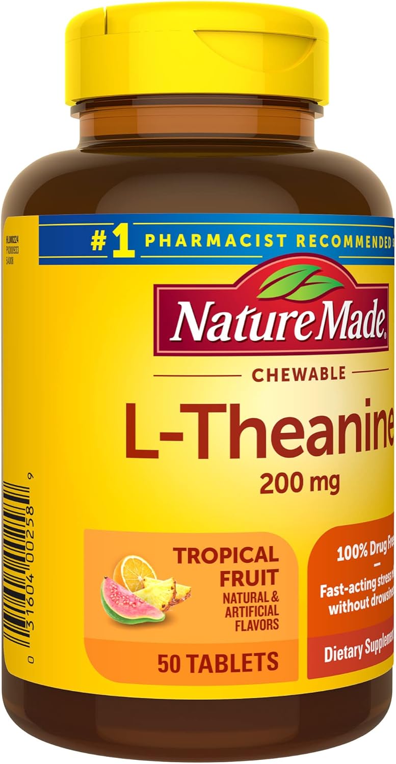 Nature Made L-Theanine 200mg chewable tablets help relax the mind without causing drowsiness for fast-acting stress relief (1). L-Theanine is an amino acid that quickly helps you manage stress in the moment. These L Theanine chewables come in a delicious tropical fruit artificial and natural flavor and have no color added, no dairy, and are gluten free, 100% drug free, and suitable for vegetarians. Adults, chew one L Theanine tablet per day as needed. Start your day with Nature Made L-Theanine supplements. (1)Works within 30 minutes. *Based on a 2022 survey of pharmacists who recommend branded vitamins and supplements. These statements have not been evaluated by the Food and Drug Administration. This product is not intended to diagnose, treat, cure, or prevent any disease.
