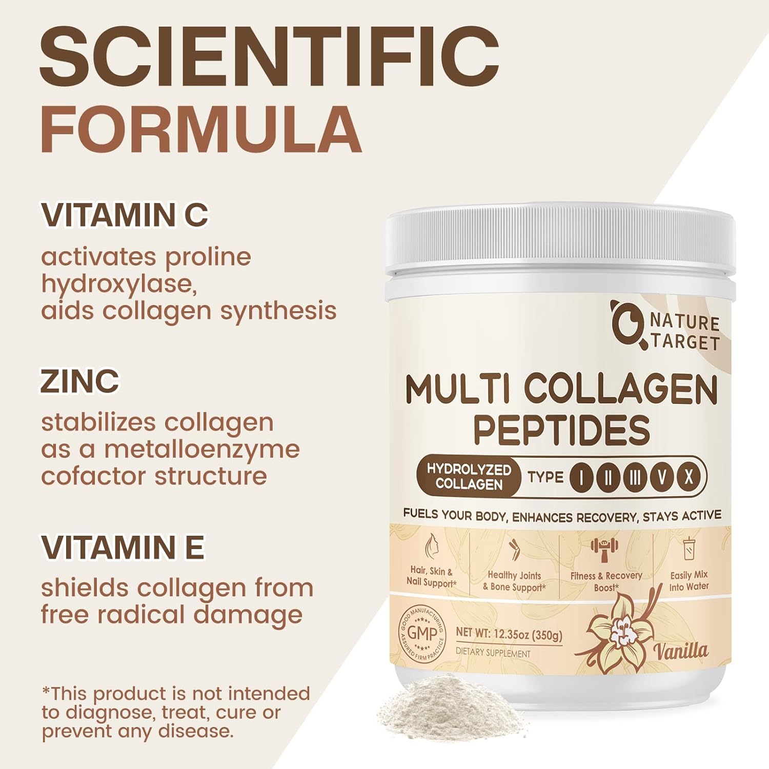 Begin your health transformation with NATURE TARGET Vanilla Collagen! Infused with a rich, creamy vanilla flavor, our advanced multi-collagen blend is your perfect partner for enhanced wellness. Every serving delivers essential nutrients to help you feel and look your best.