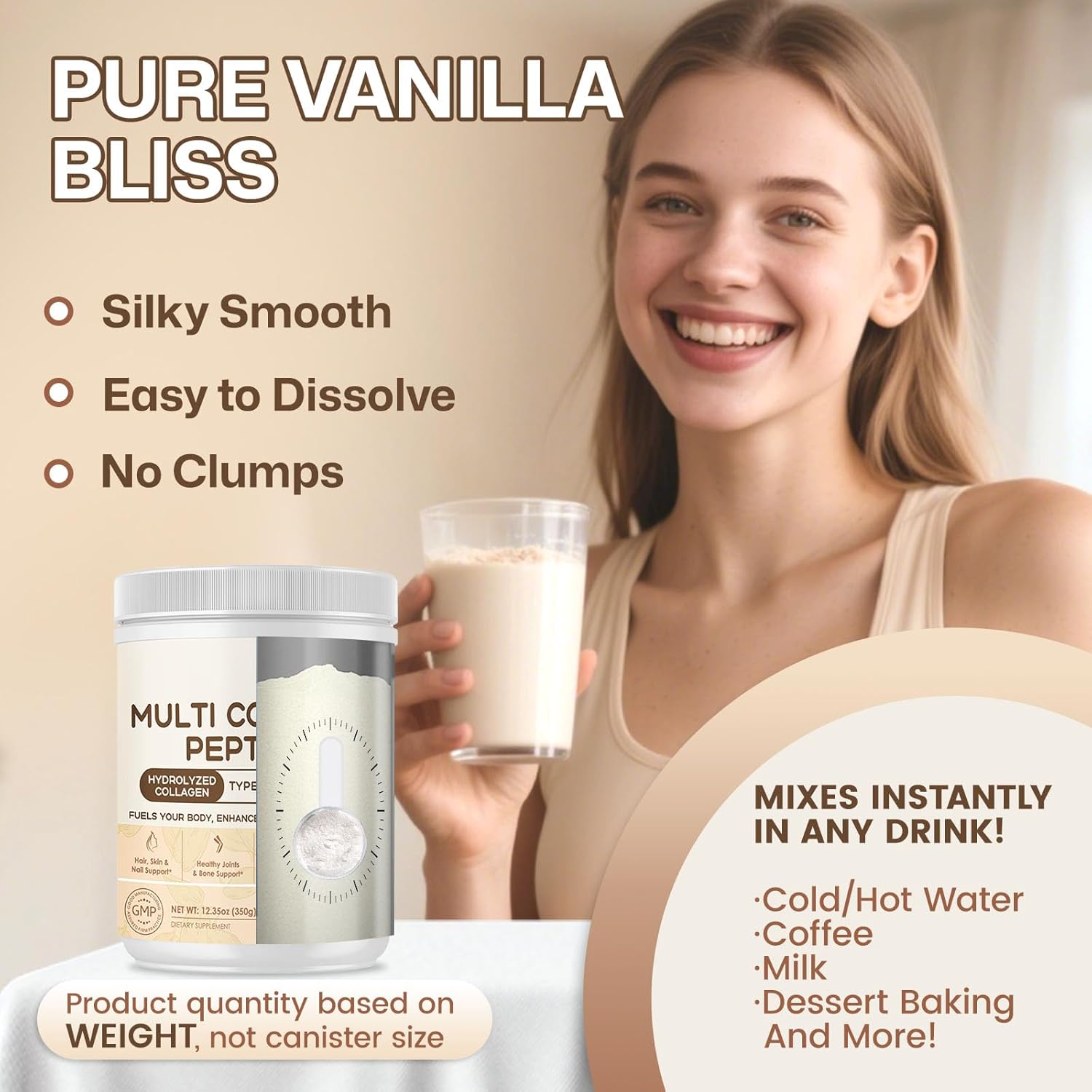 Supplement collagen anytime, anywhere: natural vanilla flavor, no artificial additives or sweeteners. Rich and mellow taste, easily blended into coffee, tea or milkshakes, adding healthy enjoyment. Whether it is busy breakfast time or after fitness, you can quickly replenish nutrition