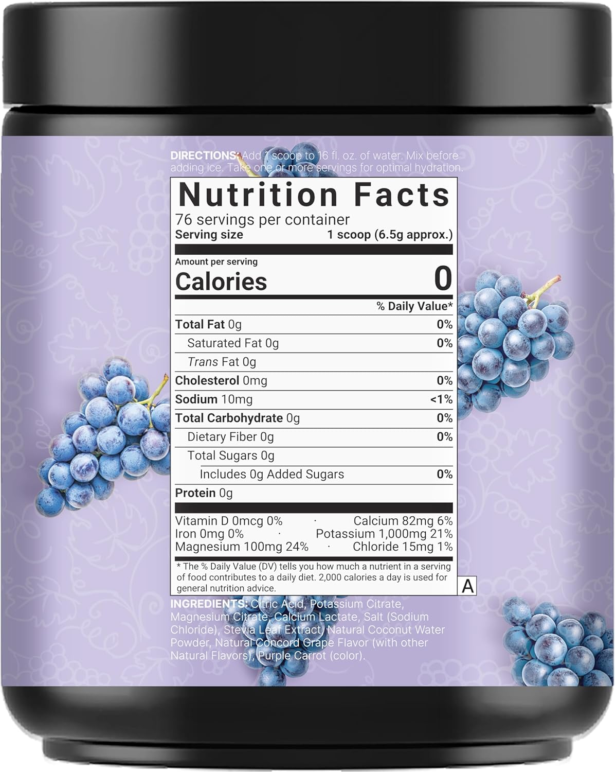 Refreshing concord grape flavored electrolyte powder, sourced naturally from coconut water and essential minerals, 500g supply (1.1 pound), 76 servings.