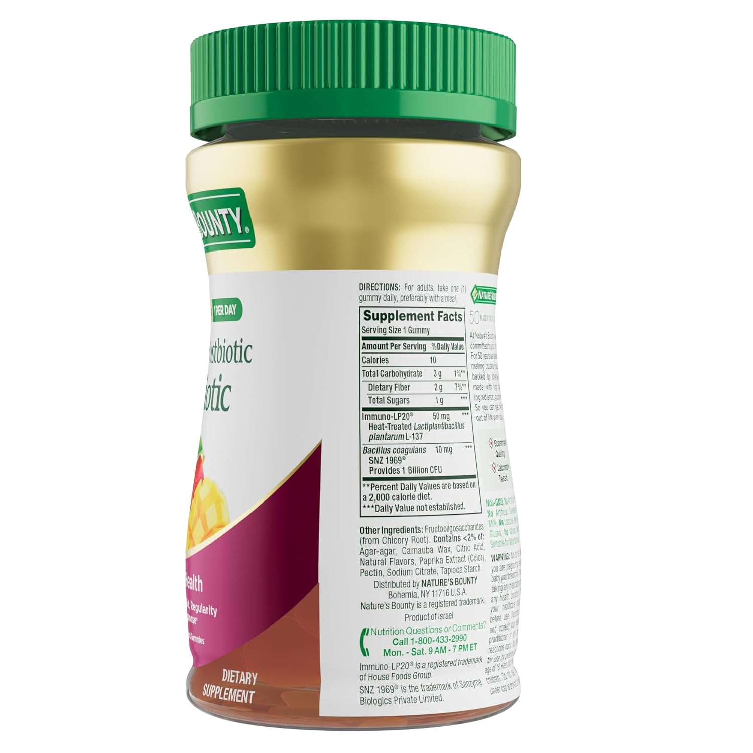 Nature’s Bounty Pre + Pro + Postbiotic gummies provide a triple action formula for your digestive and immune health in one convenient, delicious tropical mango-flavored gummy.(1) This unique 3-in-1 supplement combines prebiotics, probiotics, and postbiotics to support gut health, regularity, and immune health.(1) The prebiotics nourish and help increase good gut bacteria, while the probiotics help ease occasional gut discomfort including gas and bloating.(1) Additionally, the postbiotics support immune health, making this formula a great digestive health and immune support solution.(1) With just one gummy a day, you’ll enjoy a powerful combination of benefits in an easy-to-take supplement. Plus, you’ll look forward to taking this delicious tropical mango gummy every day. Nature’s Bounty Pre + Pro + Postbiotic gummies deliver a high-quality, great-tasting way to support your wellness.(1) Perfect for those looking to support their gut health, immune health, and digestive health.(1) Adults: take one gummy daily, preferably with a meal.