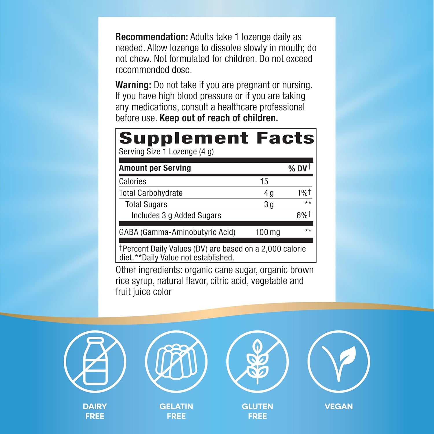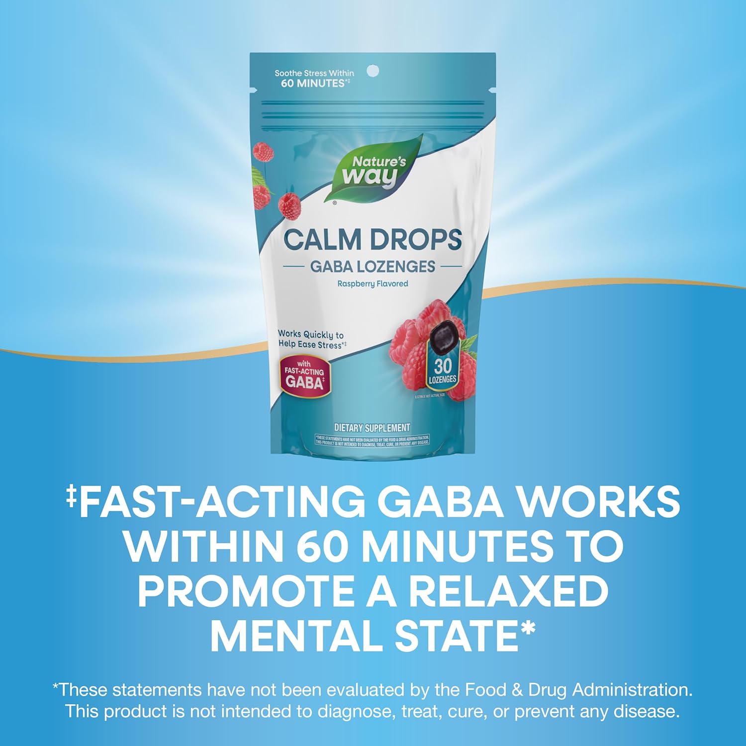 Stress is everywhere: at the office, at home, on TV, and on your phone. Reduce stress and calm your mind when you need it most with Nature’s Way Calm Drops.* *Fast-acting GABA works within 60 minutes to promote a relaxed mental state.* Keep these convenient, individually wrapped lozenges at your desk and in your bag for that moment of peace, fast.**This statement has not been evaluated by the Food and Drug Administration. This product is not intended to diagnose, treat, cure, or prevent any disease.