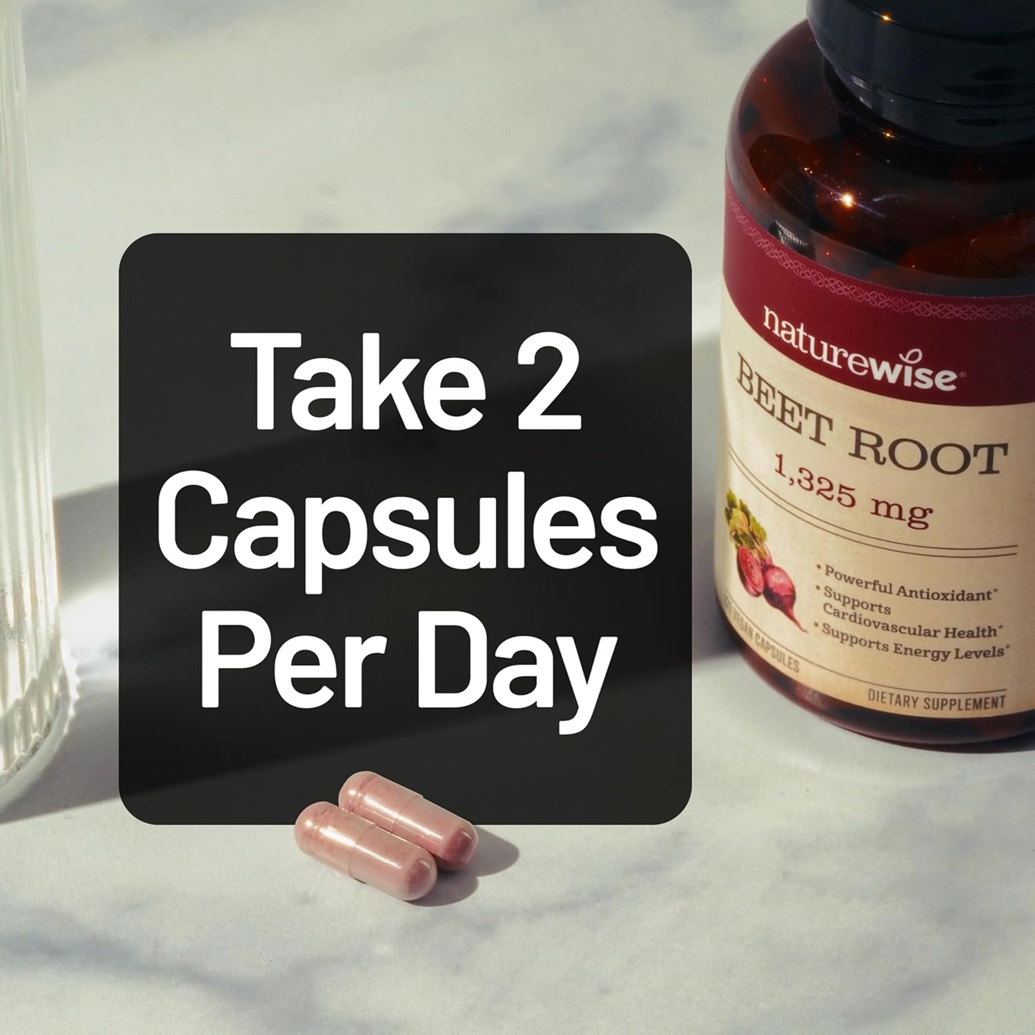 NatureWise Beet Root Capsules is a clean, non-GMO, vegan beet supplement suitable for daily use. Every serving of these vegan capsules delivers 1325 mg of organic beetroot. This beet supplement provides numerous benefits for your cardiovascular system, energy levels, and more.* Beetroots are renowned for their rich content of vitamins, minerals, and antioxidants, all of which contribute to their health-boosting properties.* By incorporating this high concentration of organic beetroot into your daily routine, you can support your overall heart health and energy. One of the standout benefits of beetroot is its ability to promote nitric oxide synthesis in the body.* Nitric oxide is a crucial molecule that plays an important role in cardiovascular health, supporting blood flow and circulation. By boosting nitric oxide levels naturally, beets offer a natural and effective way to support your heart health.* This can also lead to improved energy levels, making it easier for you to stay active and engaged throughout the day. NatureWise Beet Root Capsules are made with organic beetroot, ensuring that you’re getting a pure and non-GMO product. Furthermore, these capsules contain no wheat, gluten, dairy, eggs, soy, milk, peanuts, tree nuts, fish, shellfish, or sesame seeds. *Statements regarding dietary supplements have not been evaluated by the FDA and are not intended to diagnose, treat, cure, or prevent any disease or health condition.