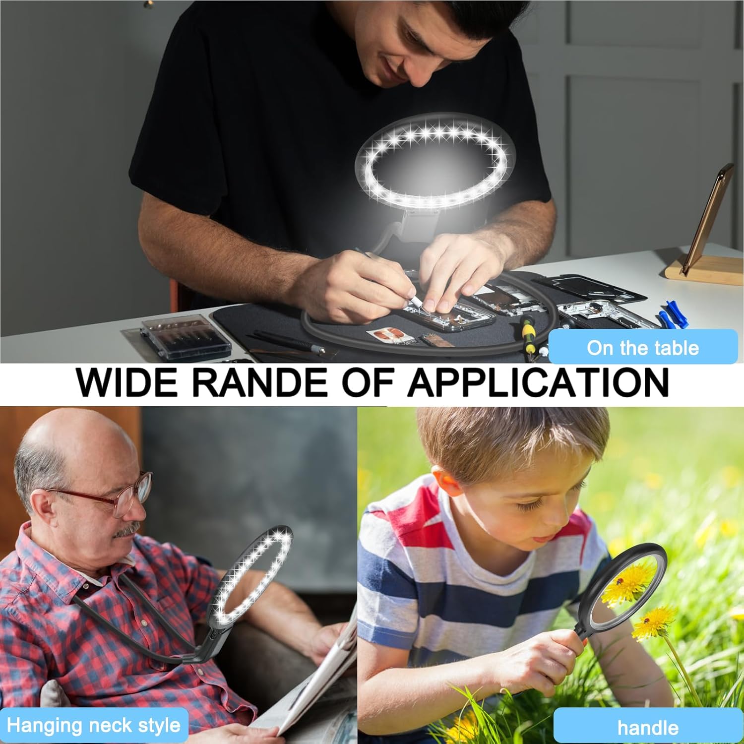 3-IN-1 MAGNIFYIING GLASS: The rechargeable magnifying glass with light can be worn around the neck, or it can be firmly placed on a table or used as a handheld magnifying glass; this lighted magnifier can meet your needs for close-up work such as reading, sewing, crafts, checking jewelry and coins in daily life and work