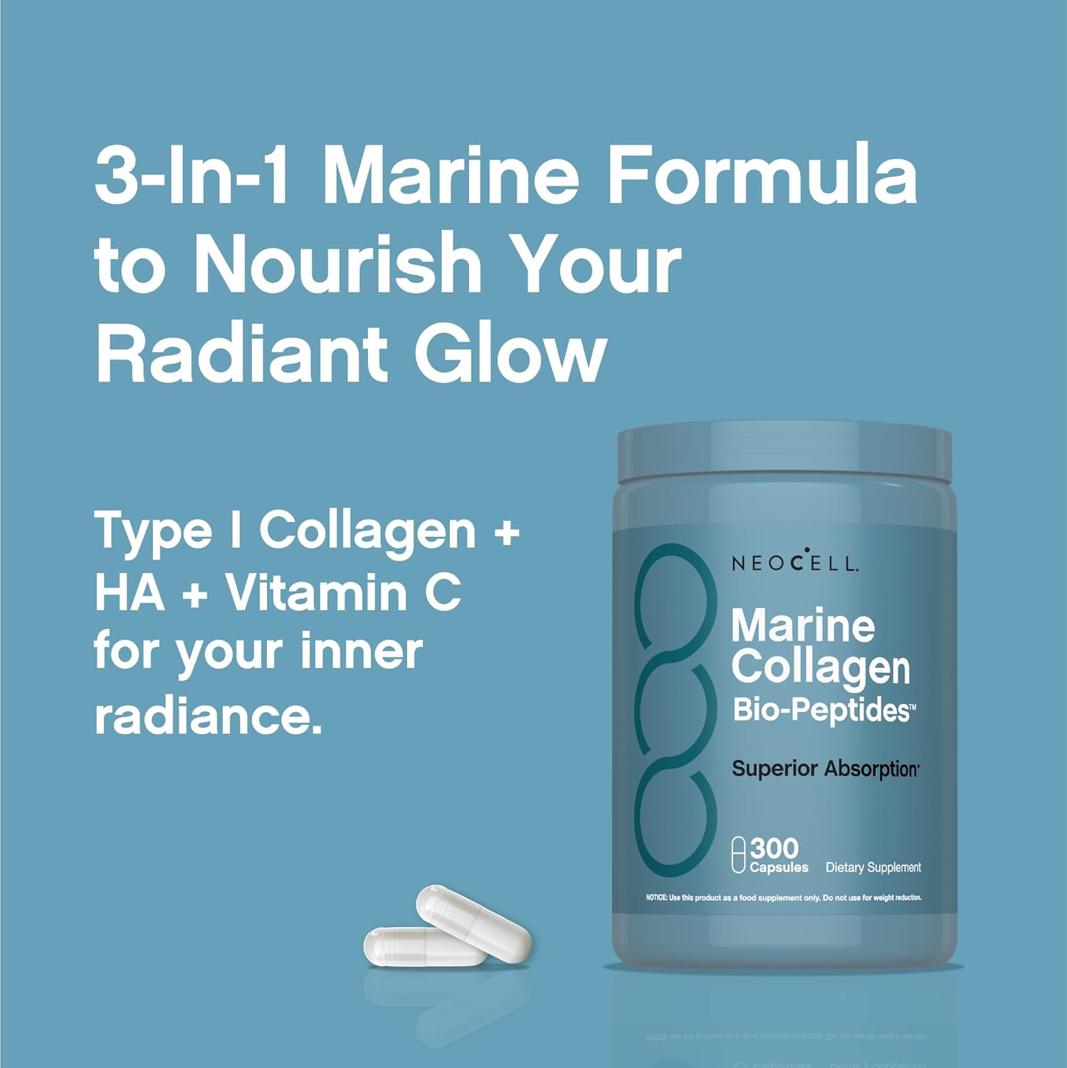 Marine Collagen Bio-Peptides Unleash your inner radiance with NeoCell Marine Collagen Peptides+ Hyaluronic Acid. This premium formula delivers 2,000 mg of marine-sourced collagen plus 20 mg of hyaluronic acid, along with key vitamins and minerals per serving. Designed for daily support so you can shine from the inside out. 300 Capsules These capsules offer a convenient way to incorporate collagen into your daily routine. Great for those that are on-the-go, these capsules are also free of gluten, soy, wheat, and lactose. Additionally, this value size bottle of 300 capsules will provide you with more than a two-month supply. NeoCell For nearly 30 years, NeoCell has been a trusted leader in unlocking the transformative benefits of collagen and essential nutrients. Trusted by millions, our products are based in science and designed to illuminate your inner beauty in a way that stands the test of time.** **This statement has not been evaluated by the Food and Drug Administration. This product is not intended to diagnose, treat, cure, or prevent any disease. *Compared to non-enzymatically treated gelatin.