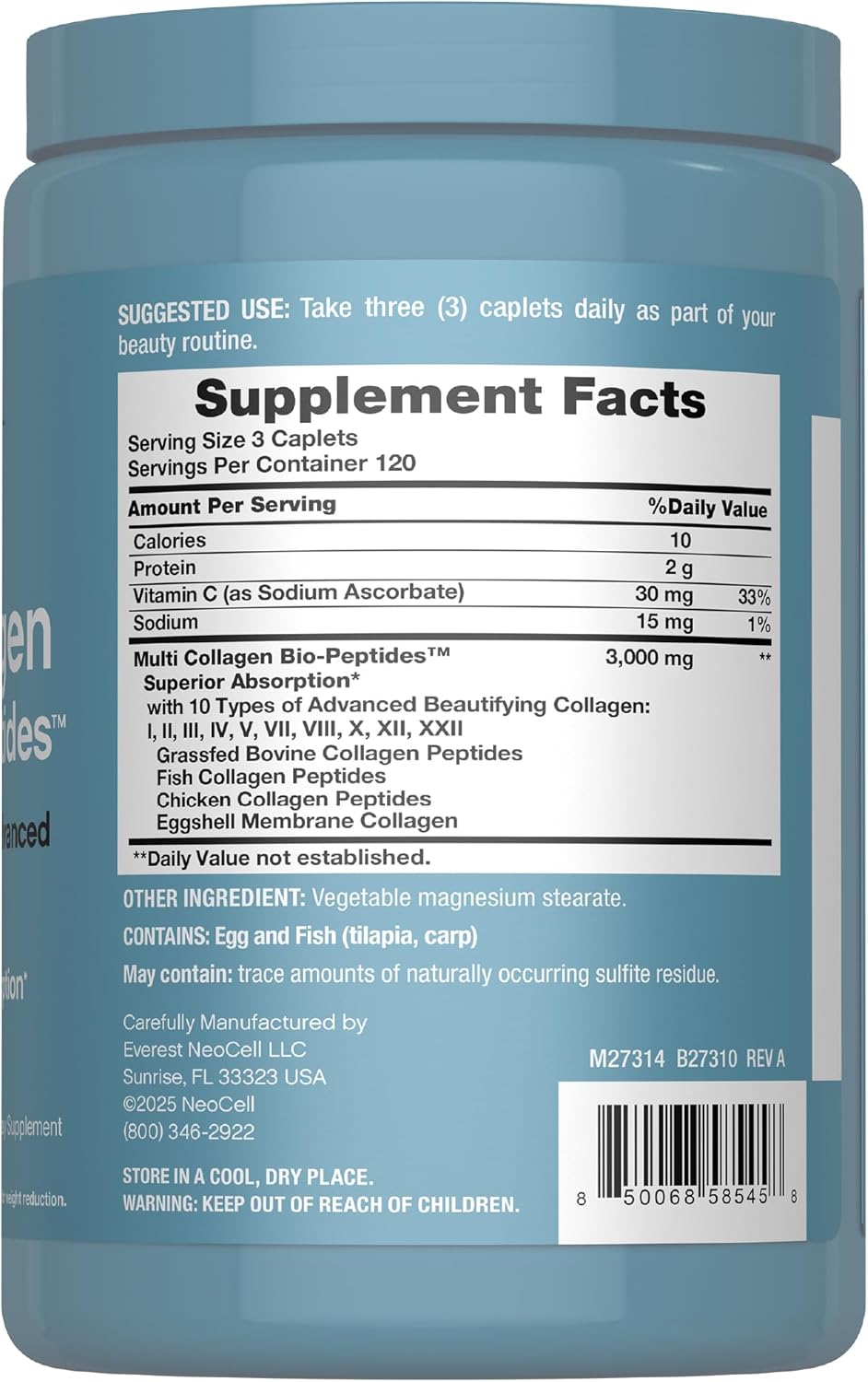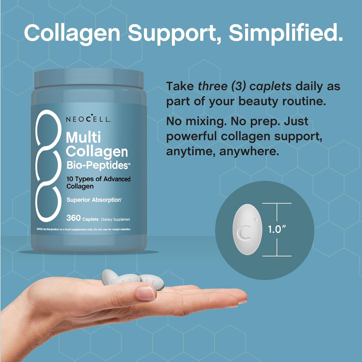 Multi Collagen Bio-Peptides Reveal your inner glow with NeoCell Multi Collagen caplets. Each serving delivers 10 types of beautifying collagen in the convenience of one formula. Designed for enhanced benefits, you can support healthy hair, skin, and nails each day.* 360 Caplets These easy-to-take caplets are perfect for those who are always on-the-go. With 10 types of collagen in each serving, these caplets make it simple to receive a comprehensive approach to your beauty routine. Plus, this quantity of 360 caplets will last you nearly four months! NeoCell For nearly 30 years, NeoCell has been a trusted leader in unlocking the transformative benefits of collagen and essential nutrients. Trusted by millions, our products are based in science and designed to illuminate your inner beauty in a way that stands the test of time.* *These statements have not been evaluated by the Food and Drug Administration. This product is not intended to diagnose, treat, cure, or prevent any disease. **Compared to non-enzymatically treated gelatin