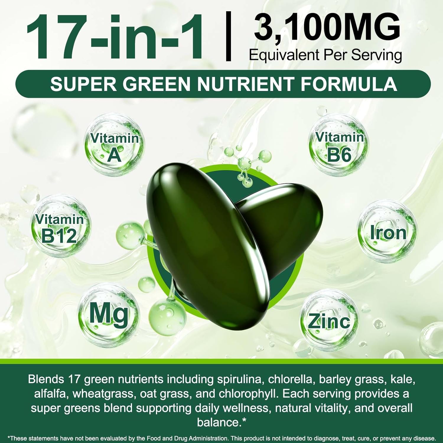 Easy-to-Swallow Softgel Convenience : Experience the simplicity of our softgel delivery system, designed for easy swallowing and optimal absorption. These convenient softgels make it simple to incorporate powerful green nutrition into your daily routine, helping you maintain consistent wellness support wherever life takes you.