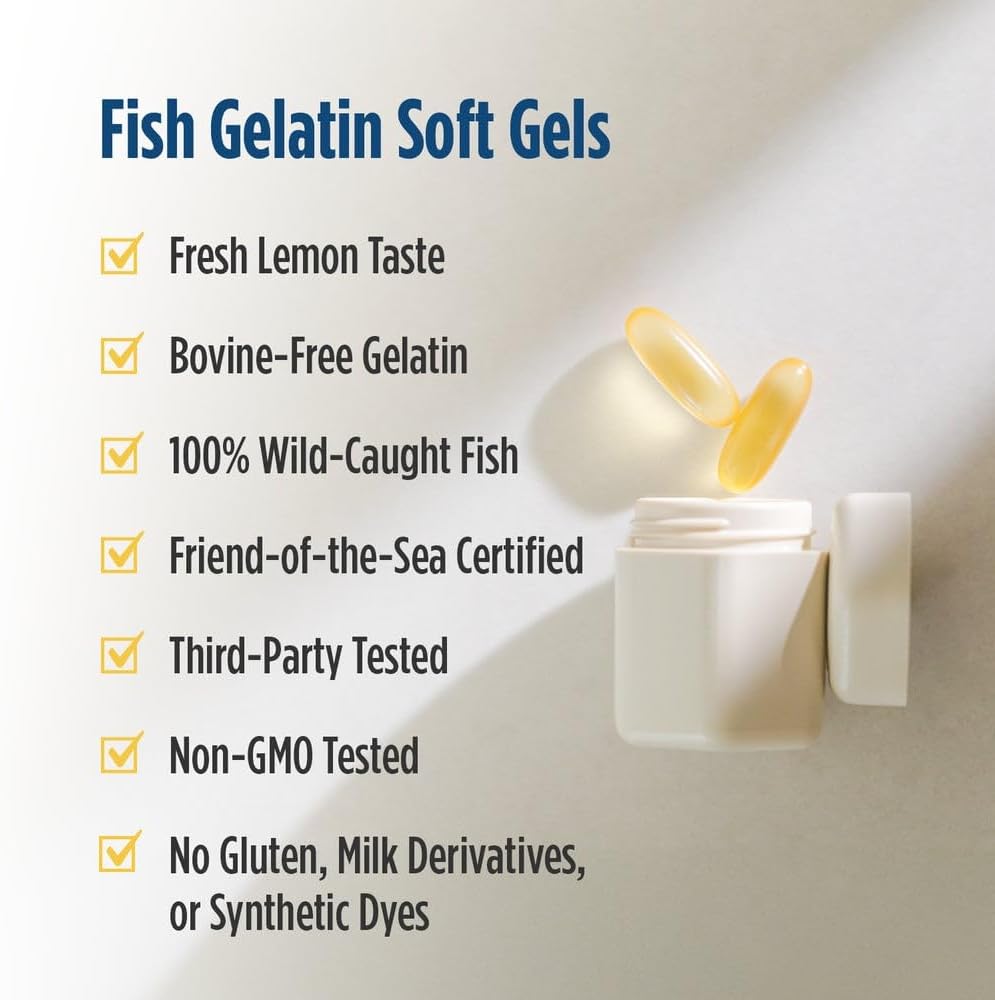 BETTER ABSORPTION, BETTER TASTE, NO FISHY BURPS – All of our omega-3 fish oil concentrates are in the triglyceride molecular form (the form naturally found in fish) for optimal absorption. Ultimate Omega in Fish Gelatin has a great lemon taste.