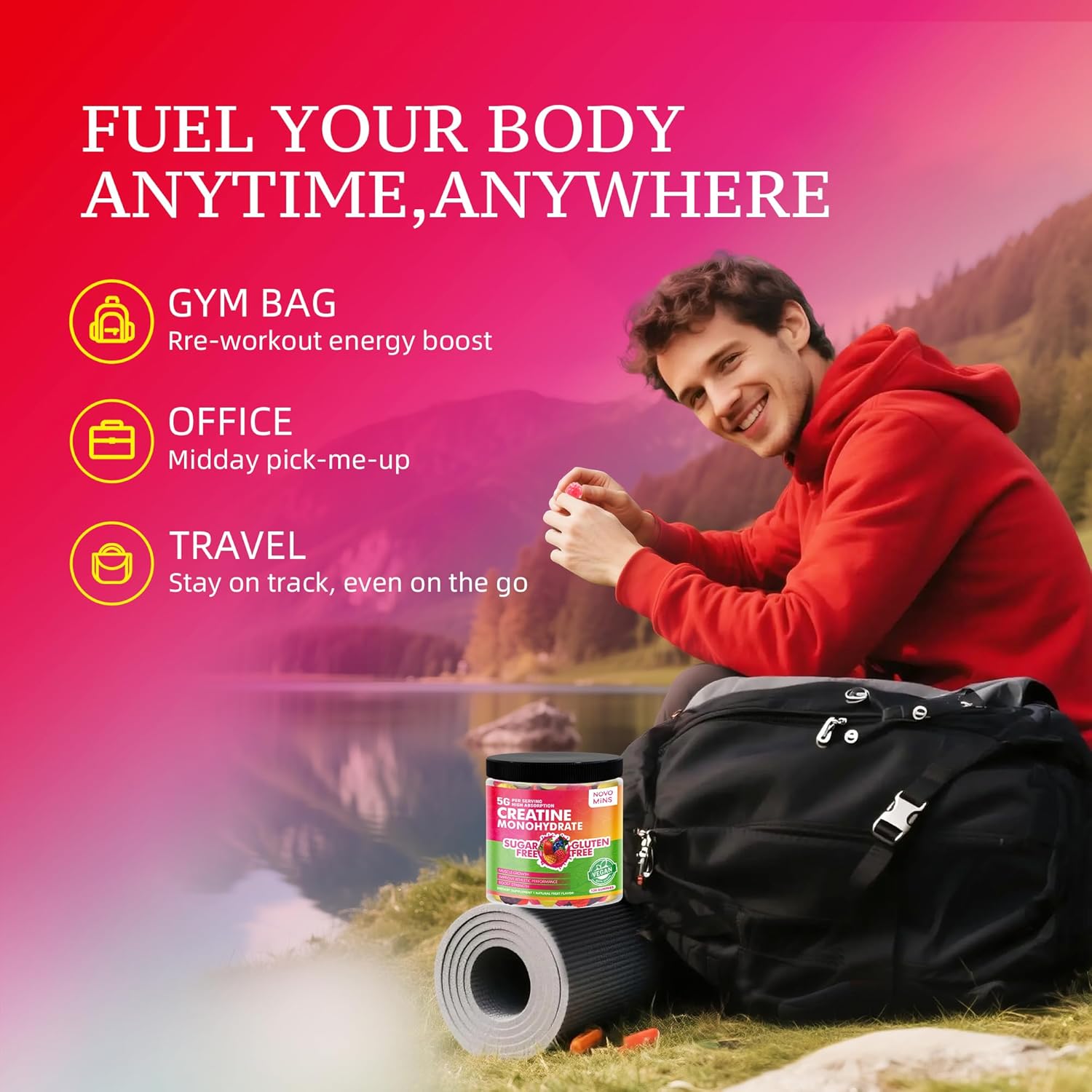 [Vegan, Gelatin Free, Sugar free]: Each bottle contains 120 count vegan, non-GMO & gluten-free, sugar free creatine monohydrate gummies. Super delicious.