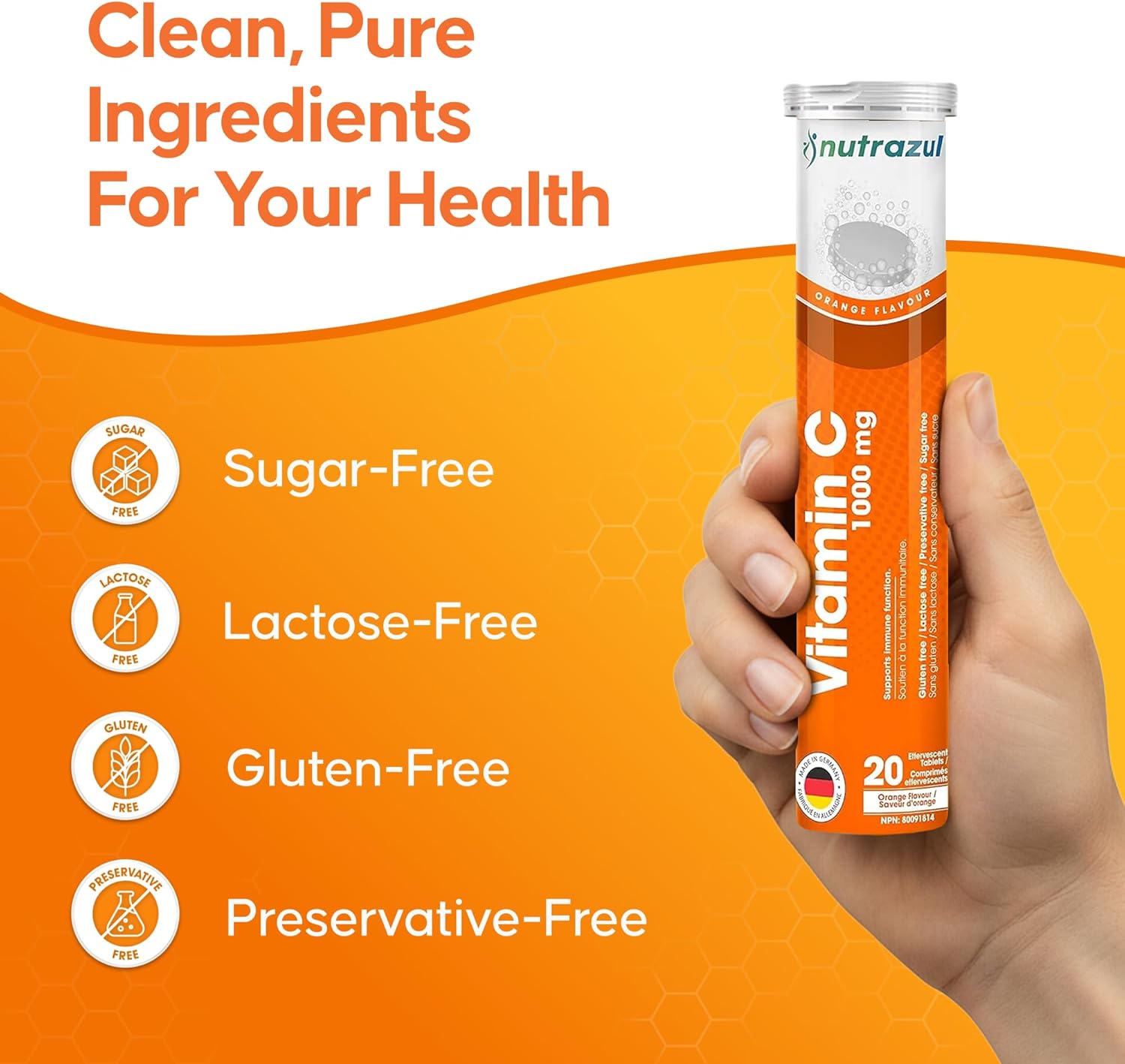 Clean Ingredients: Nutrazul Vitamin C tablets are free from gluten, lactose, sugar, and preservatives, providing a clean formula without unnecessary ingredients.