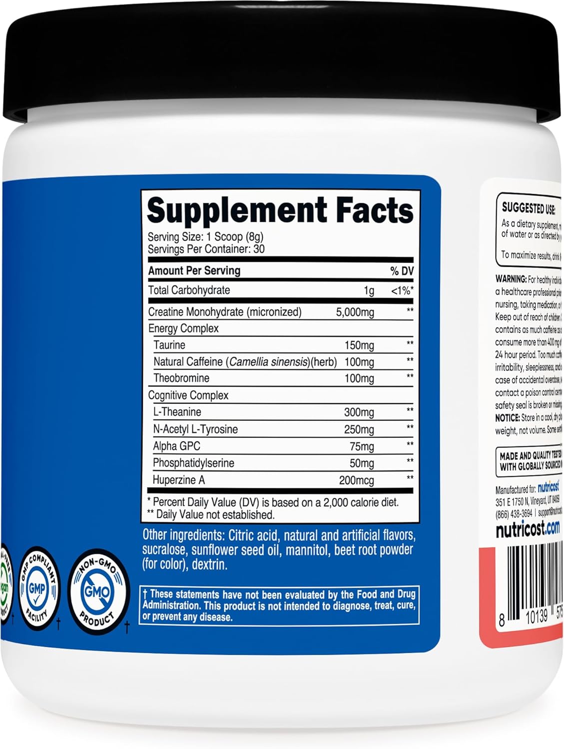 Nutricost Creatine + Energy is manufactured in a GMP-compliant facility and third-party tested for quality.
