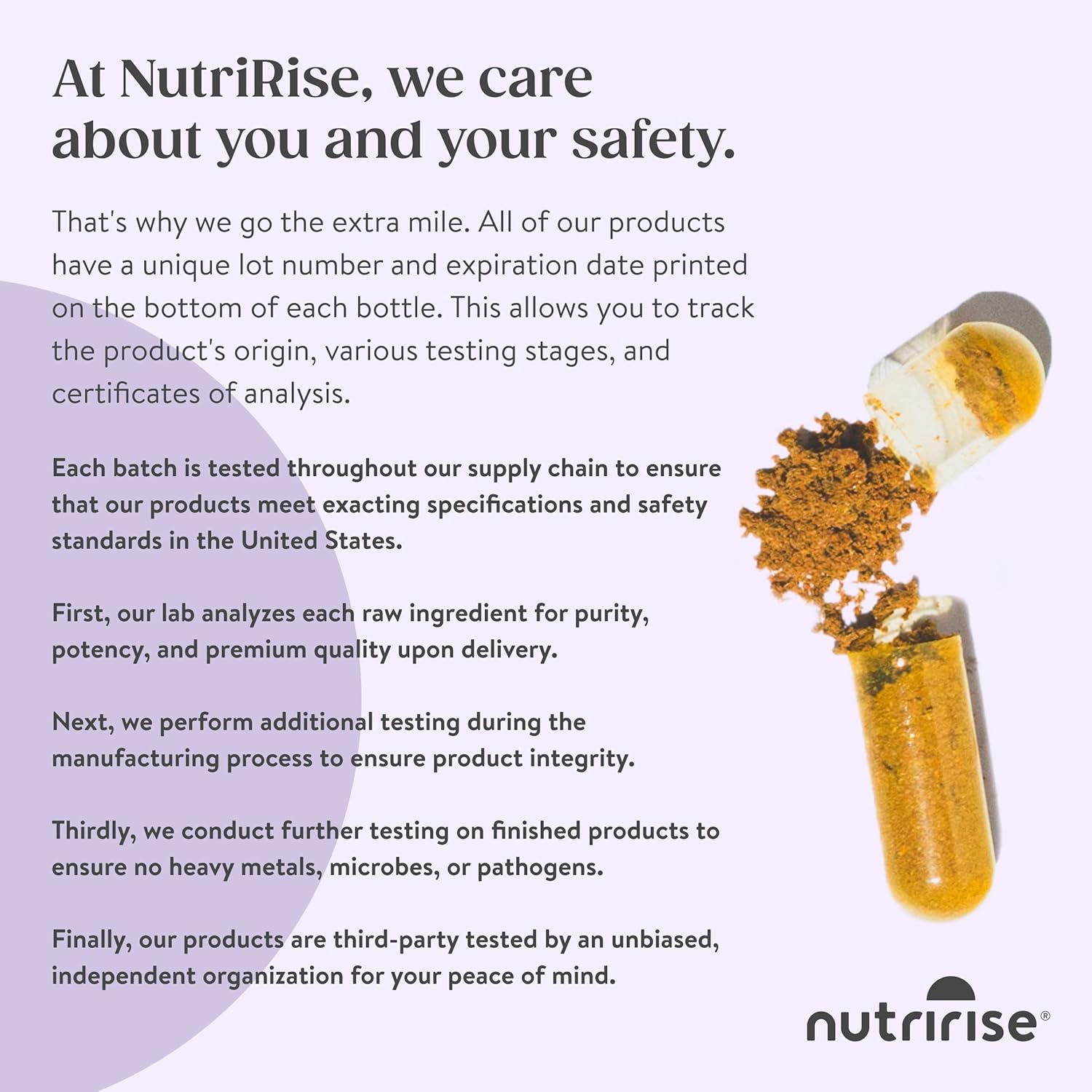 At NutriRise, we understand that dietary supplements can cause allergic reactions because they either consist of ingredients derived from high-risk allergenic foods, such as soy lecithin or cross-contamination during the manufacturing process. Therefore, we test every batch of raw materials and finished products to ensure they are 100% allergen-free.*