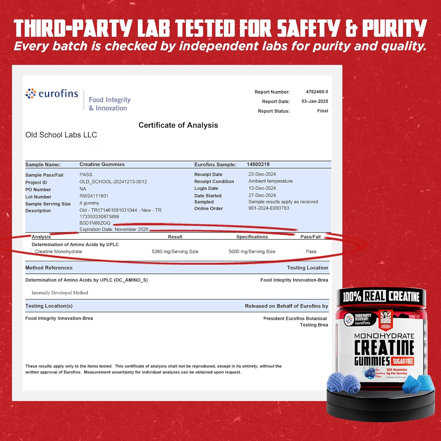 Eurofins Tested – 5000mg Per Serving: Our creatine gummies deliver exactly 5000mg of creatine monohydrate per serving, backed by rigorous Eurofins laboratory testing. This strict verification process ensures every batch meets our quality standards, so you can trust the dosage on our label. With verified creatine content, you get reliable support for muscle strength, power output, and recovery when combined with regular exercise.