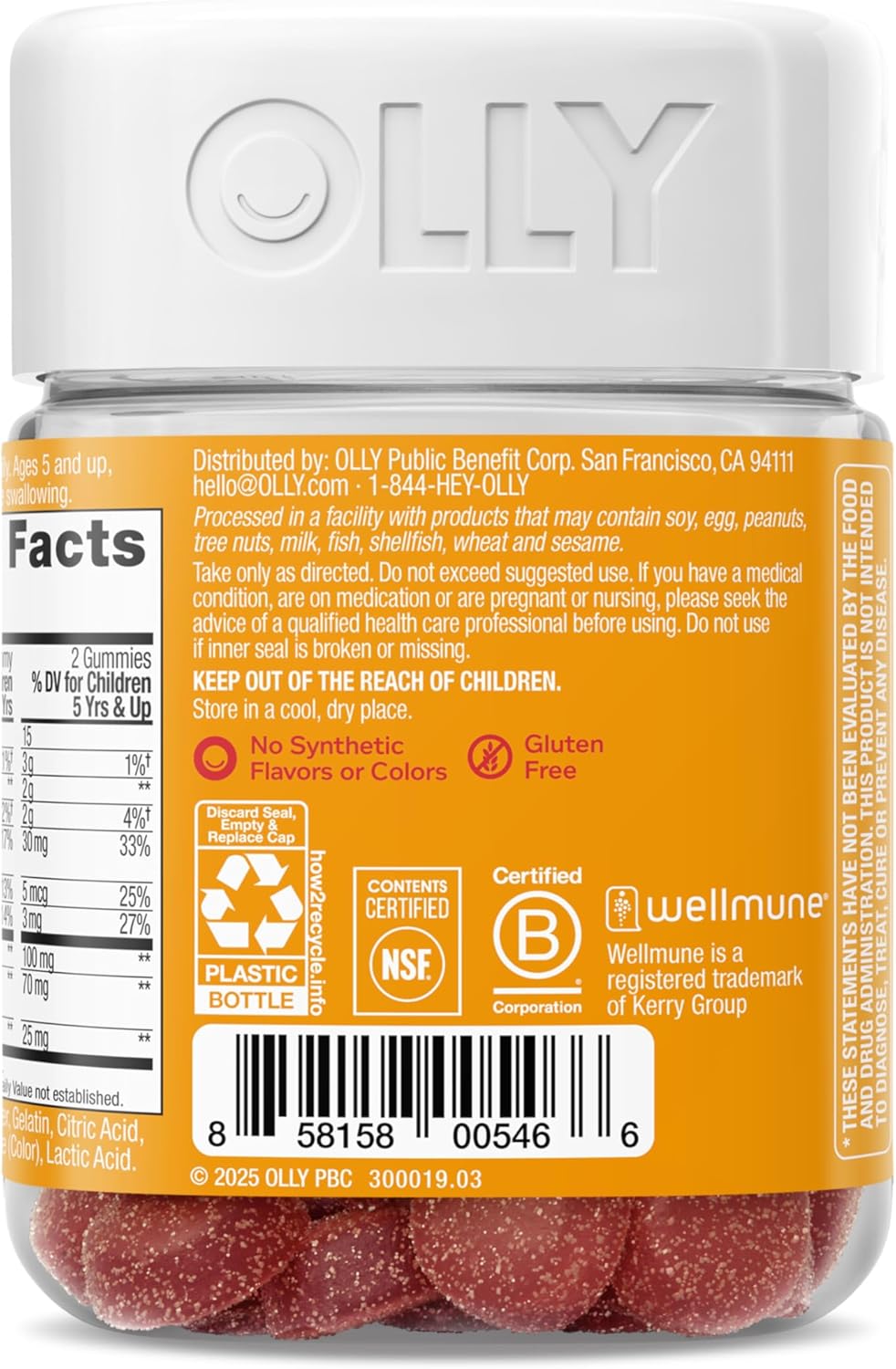 OLLY Kids Immunity gummies are packed with the good stuff kiddos need to keep up a strong immune system, rain or shine.* OLLY Kids Immunity packs a powerful blend with Wellmune® Beta Glucans, a scientifically backed ingredient for keeping little bodies immune defending cells in tip-top shape. Acerola Cherry is one of nature’s richest sources of Vitamin C. Elderberry is a super food has been used for centuries and Zinc is an essential mineral for immune support.* Good health is at the center of everything we do. That’s why we’ve made it our mission to make nutrition easy to understand. We do it by crafting products that are as effective as they are delicious—because we know when something feels good, you’re more likely to do it.* *These statements have not been evaluated by the Food and Drug Administration. This product is not intended to diagnose, treat, cure or prevent any disease. Wellmune is a registered trademark of the Kerry Group.