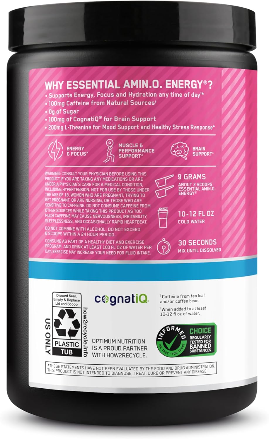 Mix up Optimum Nutrition’s ESSENTIAL AMIN.O. ENERGY anytime you want a boost of enhanced energy and alertness – from early morning workout to afternoon pick-me-up, plus every activity in between. Each serving provides 100 mg of caffeine from natural sources to support energy and focus*(FDA Disclaimer) along with 5 grams of essential BCAA amino acids and electrolytes to support hydration. Use as a pre-workout powder, postworkout recovery drink, or use this energy drink mix anytime you need a morning or afternoon pick-me-up. With zero sugar, it’s a more functional option than sugary energy drinks. This 10.5-ounce package contains 30 servings of electrolyte powder in a delicious Watermelon flavor. ESSENTIAL AMIN.O. ENERGY + ELECTROLYTES Drink Mix offers potassium, sodium and magnesium to help support function and fluid balance. Choose from a variety of natural fruit flavors. Get more out of your workout – and your day – with Amino Energy drinks!