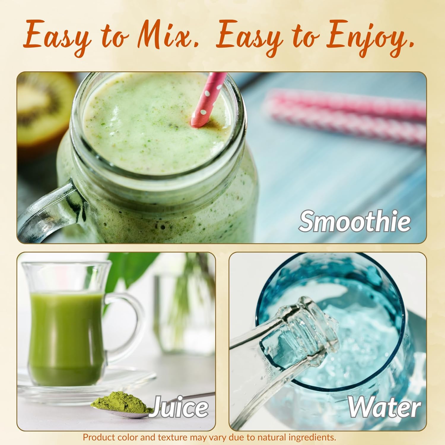 Add one scoop (6 g) to 250–300 ml (8-10oz) of water, juice, or your favorite smoothie. Enjoy a quick and delicious way to fuel your day with fiber, antioxidants, and plant-based energy. Your daily wellness ritual made simple and refreshing.