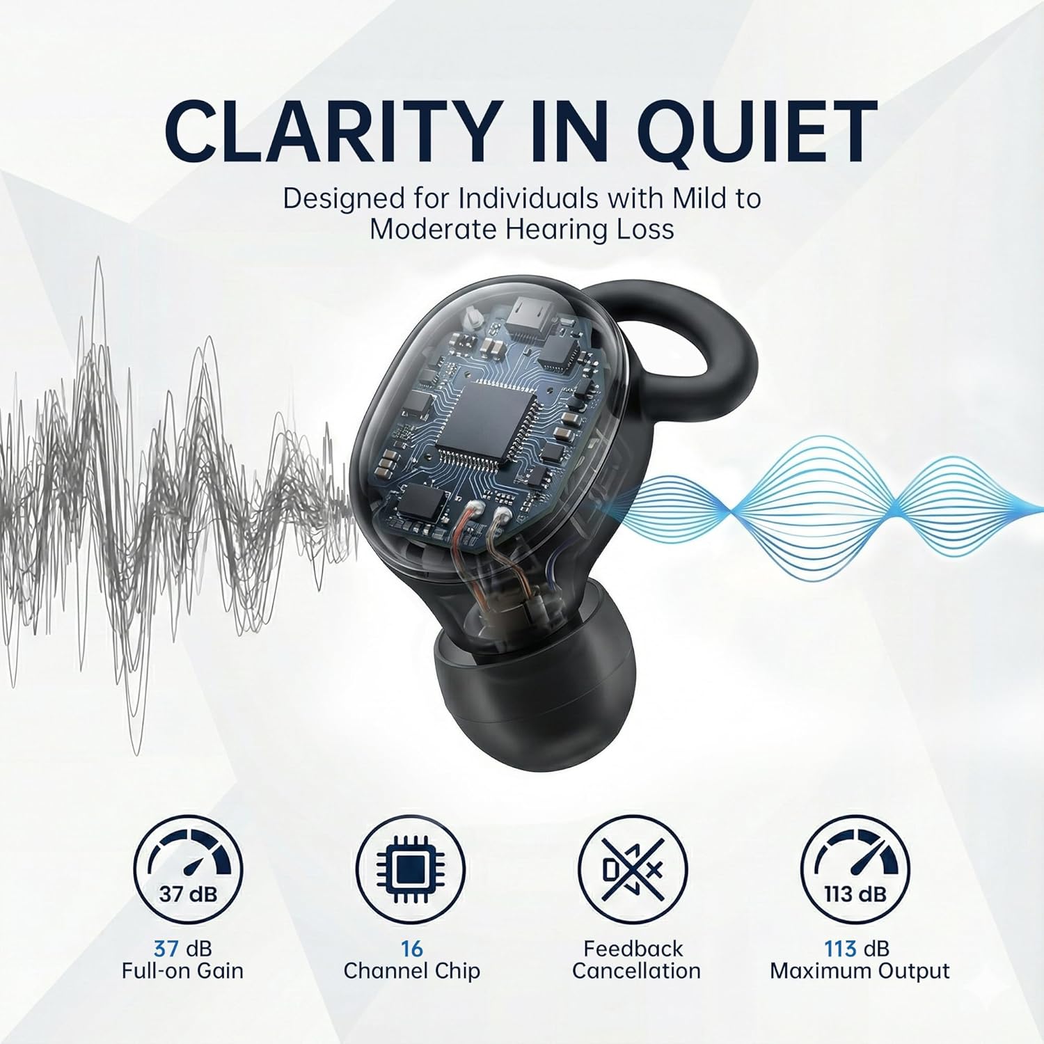 3 Levels of Noise Reduction:It features three distinct noise reduction modes and 16-channel precise adjustment. This hearing aid for seniors is designed to deliver clear audio for individuals with mild to moderate hearing loss. Suitable for various environments from quiet indoors to noisy outdoors, it has a maximum gain of 37dB. The hearing amplifiers can make daily communication more manageable for the user.