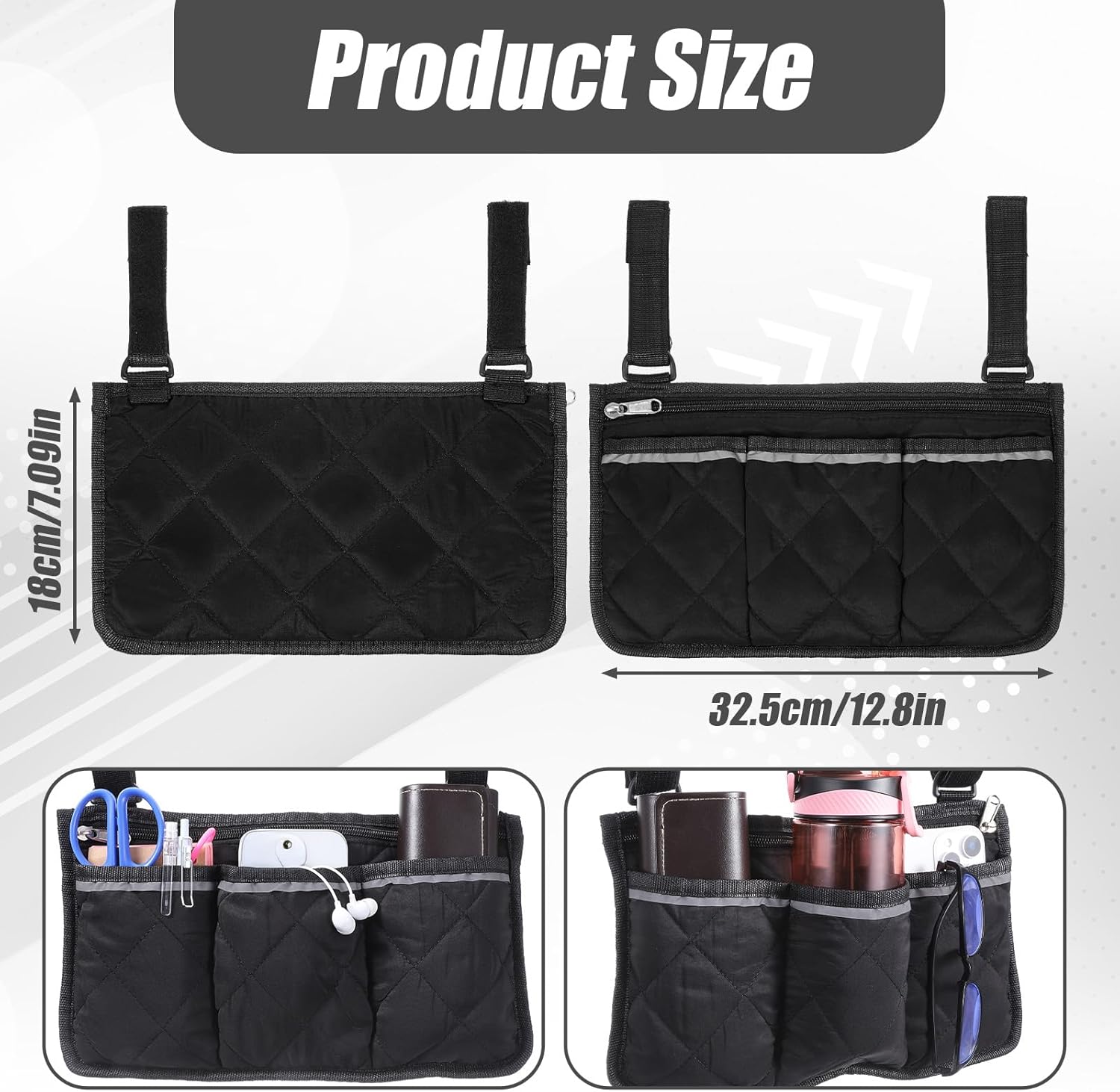 Easy to Install: The bag for the wheelchair side organizer attaches to your electric wheelchair, rollator, walker frame, or scooter in seconds, requiring no tools. The straps attach to the bag in seconds