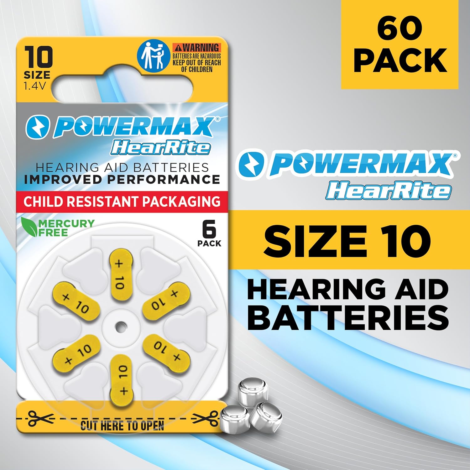 When you need reliable and long-lasting power for your hearing aids, you can count on the superior quality of the Powermax zinc air premium hearing aid battery. Zinc air Technology creates a higher energy density allowing for quick power and longer shelf life. Compatible with a wide range of hearing aid brands, these hearing aid batteries come in a convenient, cost-effective 60 count pack so that you can enjoy frequent hearing aid use throughout the day, and are easy to stow away when not in use for added long-term value. Our yellow tab type 10 hearing aid batteries are mercury-free and have easy change tabs allowing for quick, hassle-free use, making them perfect accessories for both frequent hearing aid users, care givers, health care professionals. Powermax is dedicated to delivering dependable and durable consumer batteries to its customers, and continues to be the industry leader in research and development.