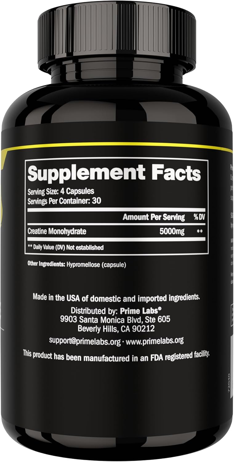 Elevate Your Workout: Prime Labs Creatine Capsules provide 5g (5000mg) of pure creatine monohydrate per serving, perfect for muscle recovery and growth. Each bottle contains 120 capsules, with a serving size of 4 capsules daily.